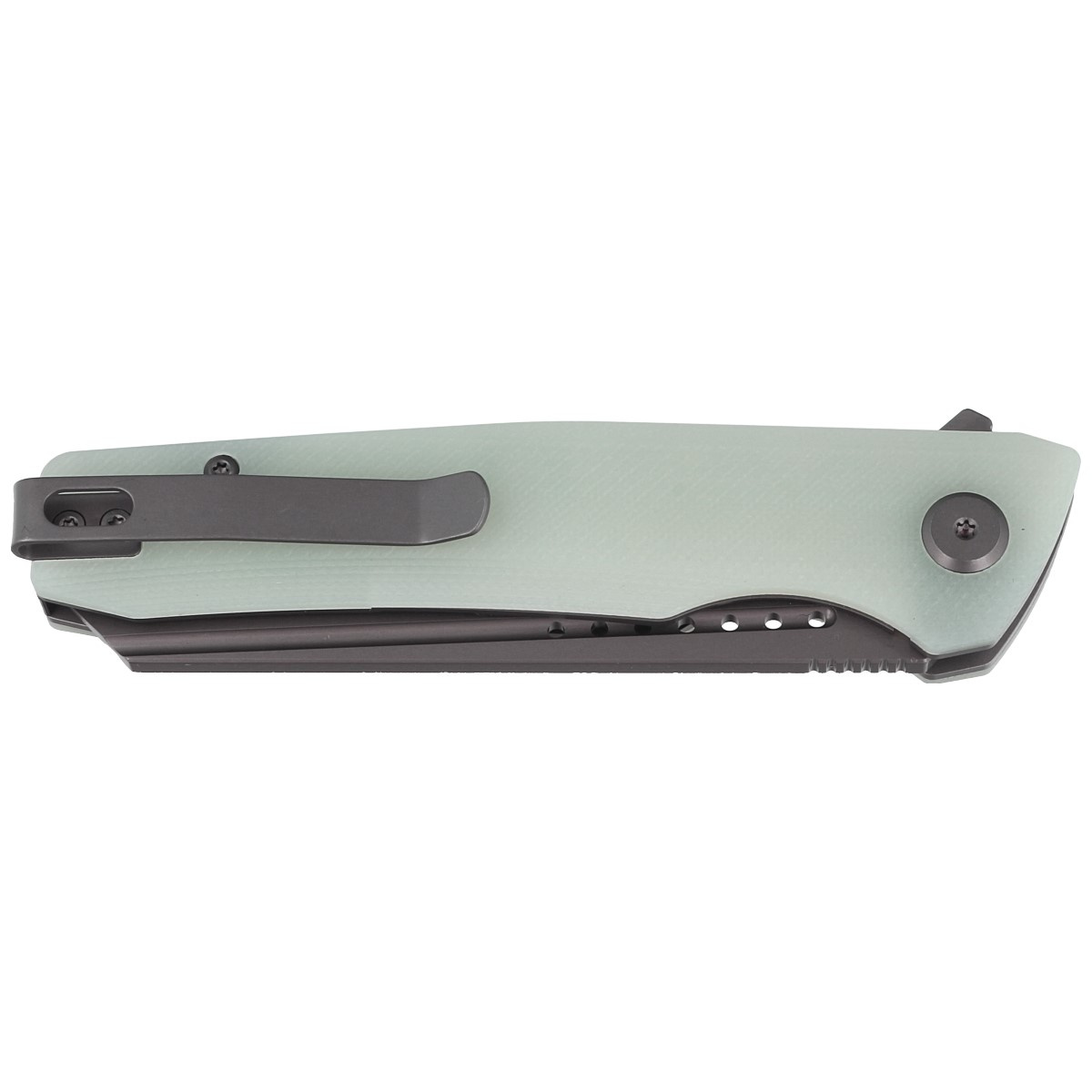 Rękojeść - okładziny z G10, praktycznie niezniszczalnego tworzywa niewrażliwego na warunki atmosferyczne, odpornego na chemikalia i uszkodzenia mechaniczne. Fazowane krawędzie okładek eliminują ostre ranty a teksturowanie powierzchni poprawia pewność uchwytu. Backspacer również wykonany z G10, do którego przymocowano okładziny, gwarantuje sztywność i wytrzymałość całej konstrukcji. Jednopozycyjny, prawostronny klips deep carry umożliwia przenoszenie noża w pozycji tip-up, czubkiem ostrza ku górze.