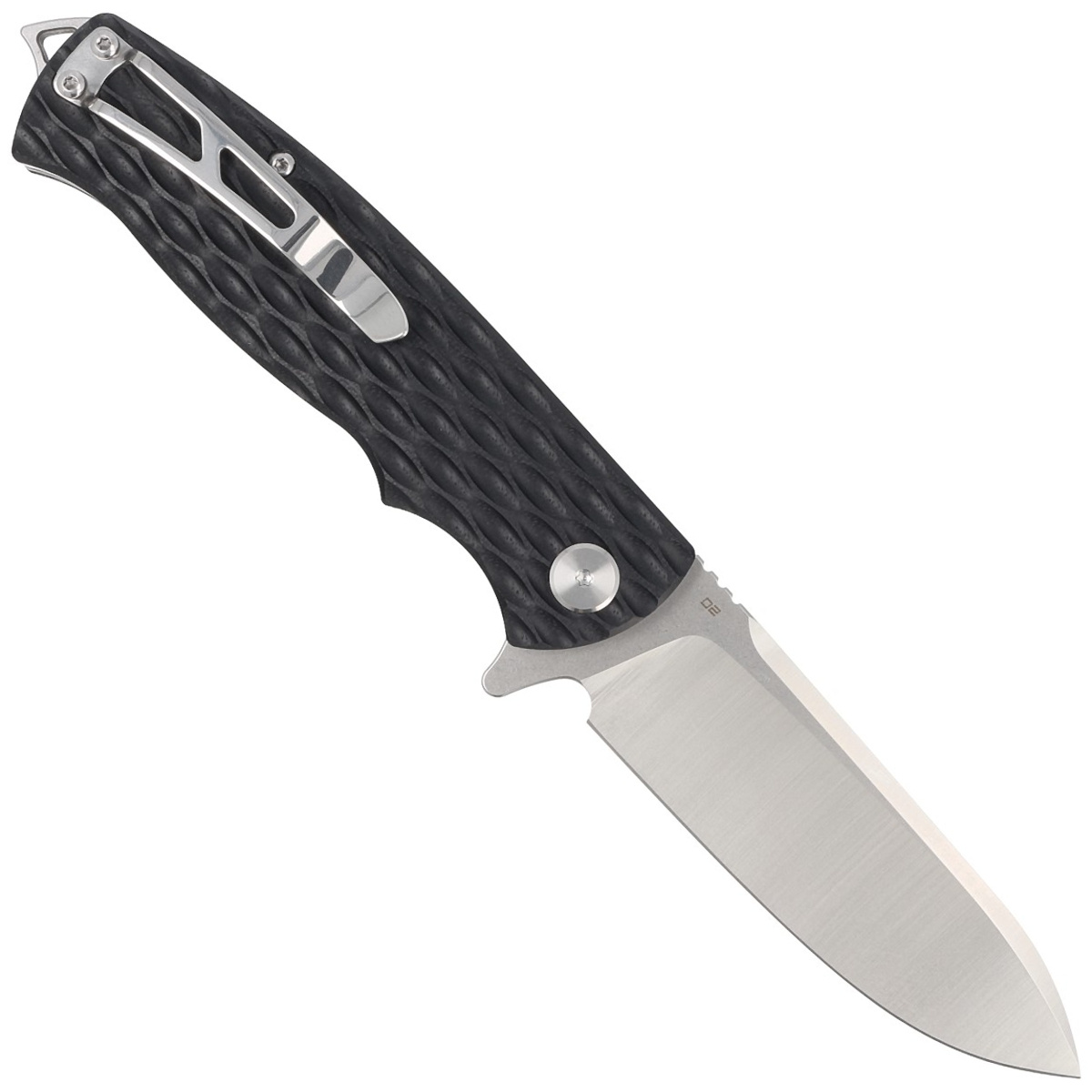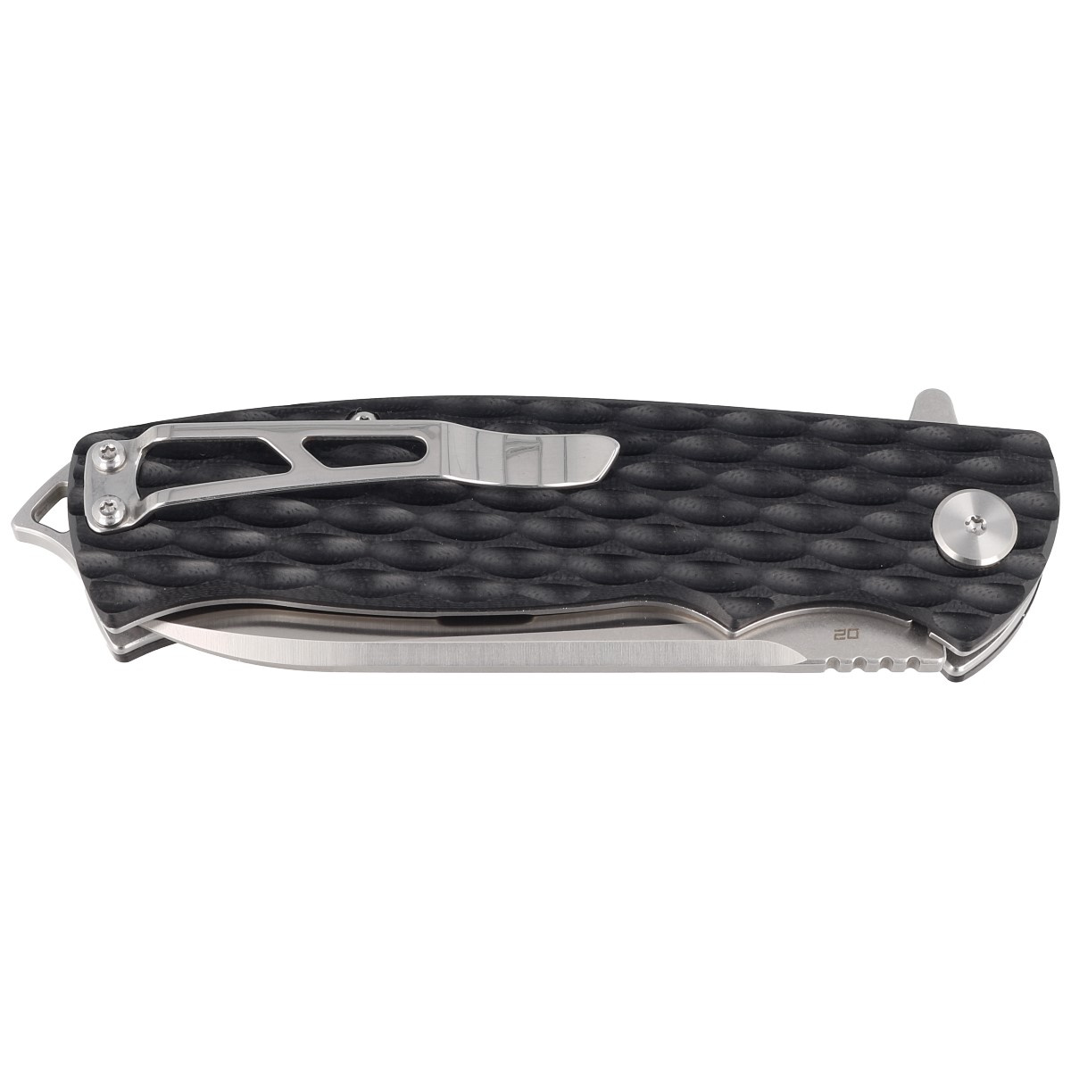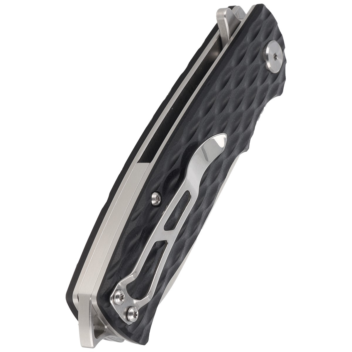 Rękojeść - okładziny z czarnego kompozytu G10, praktycznie niezniszczalnego tworzywa niewrażliwego na warunki atmosferyczne, odpornego na chemikalia i uszkodzenia mechaniczne Fazowane krawędzie okładek eliminują ostre ranty a charakterystyczne teksturowanie powierzchni poprawia pewność uchwytu. Masywny backspacer do którego przymocowano okładziny gwarantuje sztywność i wytrzymałość całej konstrukcji. Zakończenie backspacera wystaje poza obrys rękojeści tworząc kolec mogący służyć w awaryjnych sytuacjach jako zbijak do szyb lub narzędzie samoobrony. Jednopozycyjny, prawostronny klips umożliwia przenoszenie noża w pozycji tip-up, czubkiem ostrza ku górze.