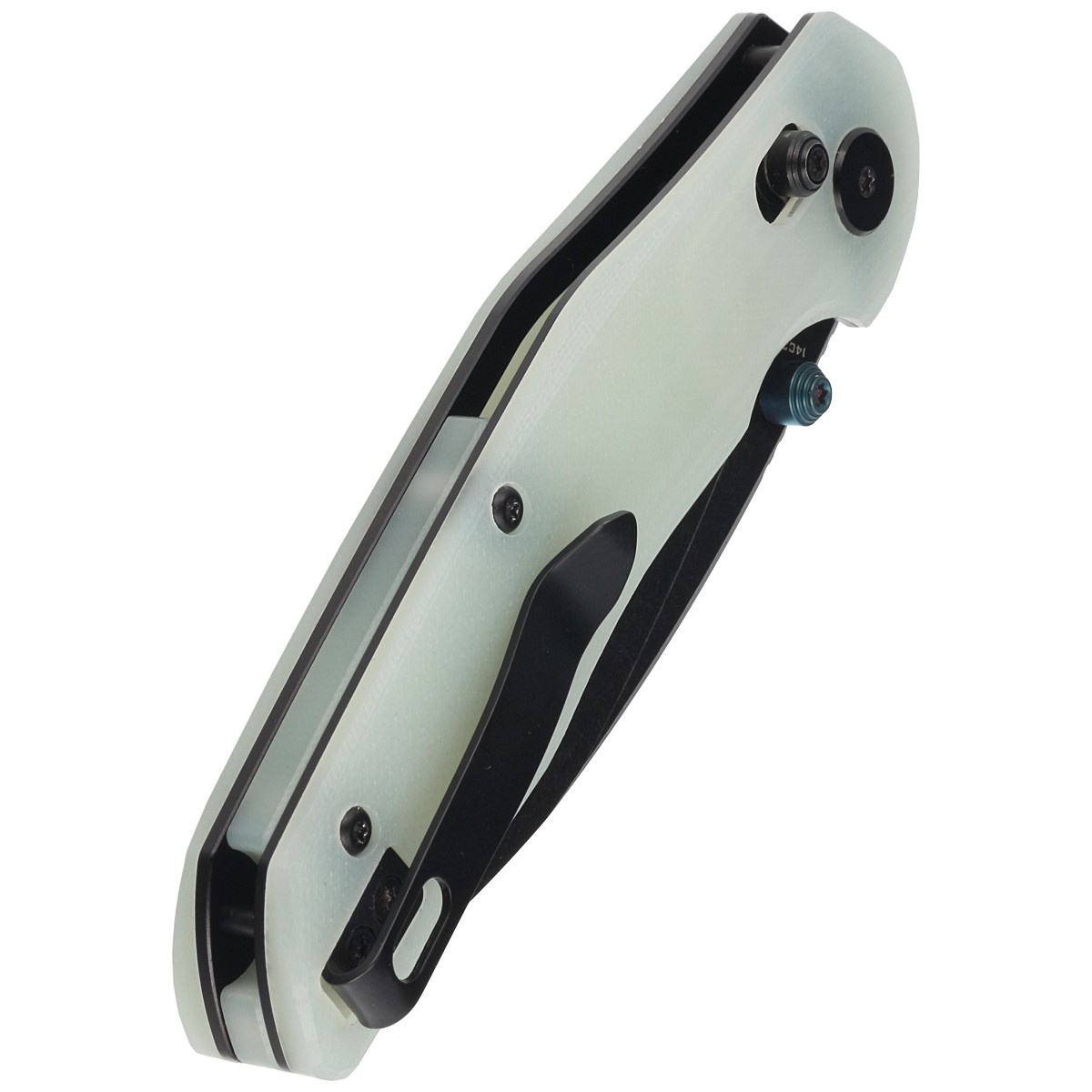 Rękojeść - okładziny z przezroczyście zielonego G10 (włókno szklane prasowane pod ciśnieniem z syntetyczną żywicą), teksturowane dla poprawienia pewności uchwytu, przykręcono do stalowej ramy noża. Masywny backspacer do którego przymocowano okładziny gwarantuje sztywność i wytrzymałość całej konstrukcji. Prosta, solidna konstrukcja daje pewność wieloletniego użytkowania. Pivot ozdobiony stylizowanym logo producenta. Jednopozycyjny (prawa) stalowy klips deep carry pozwala przenosić dyskretnie nóż w kieszeni w pozycji tip-up (czubkiem ostrza do góry).