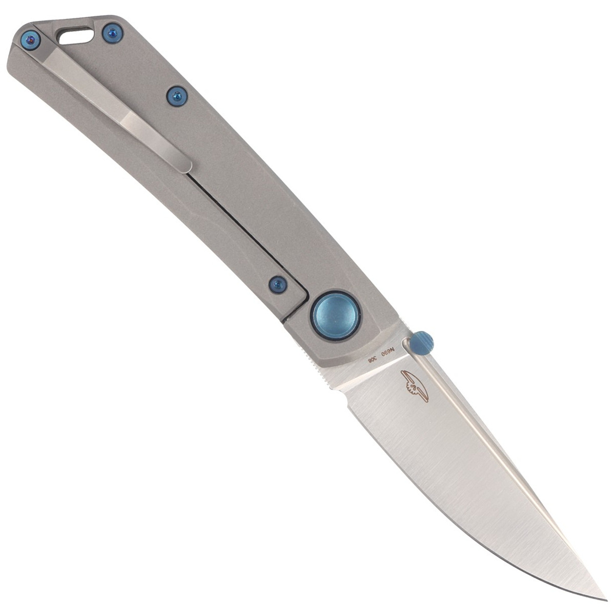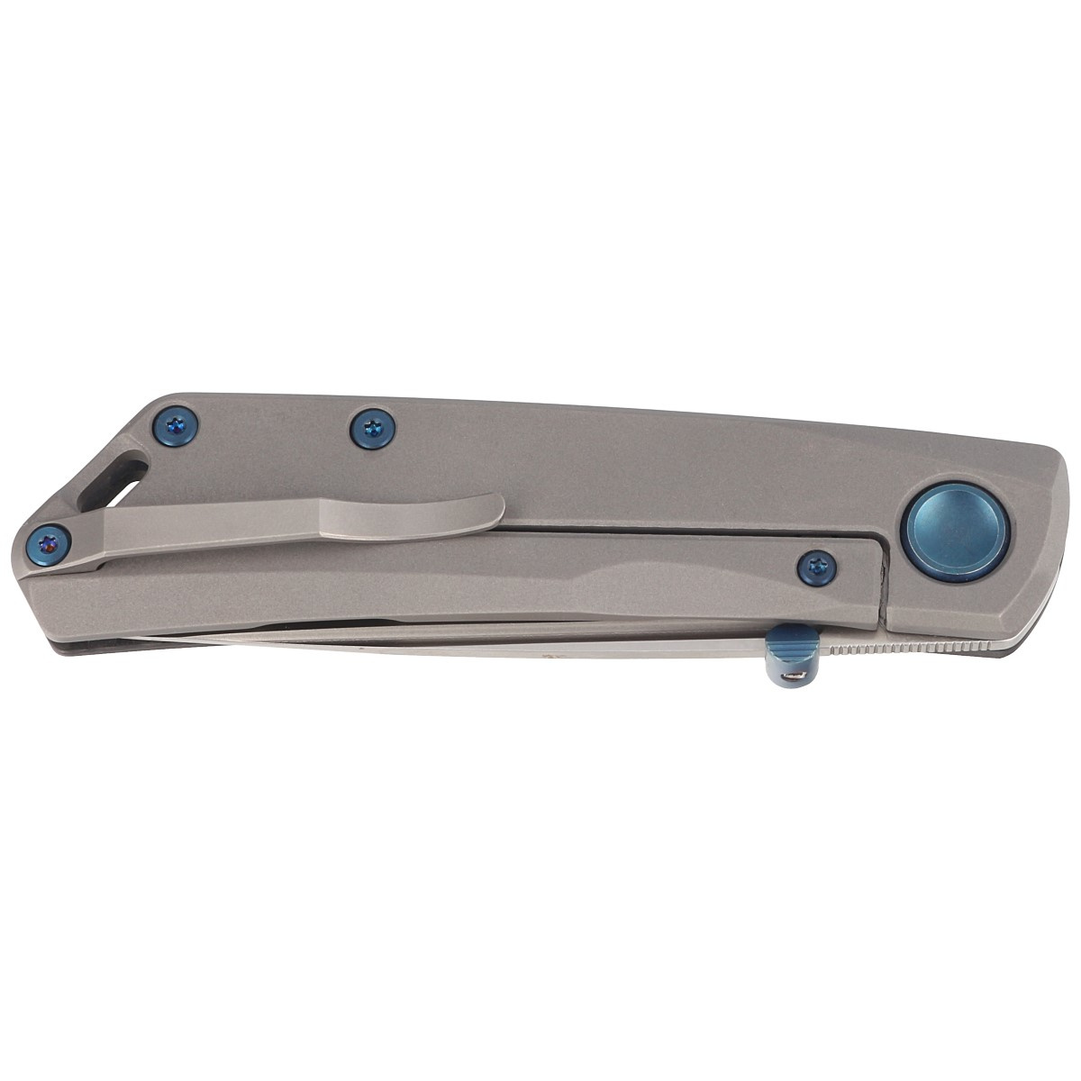Głownia - typu Drop Point z eleganckim wykończeniem Satin. Zakrzywiona krawędź tnąca zbiega się w kierunku ostrego jak igła czubka noża. Grubość klingi zapewnia wysoką wytrzymałość podczas gdy wysoki, płaski szlif daje doskonałą geometrię krawędzi tnącej oraz ekstremalną wydajność cięcia. Za gładką pracę mechanizmu otwierającego ostrze odpowiadają podkładki z fosforobrązu, dzięki którym nóż można otworzyć za pomocą długiego wycięcia pod kciuk idealnego dla osób prawo i leworęcznych. Nowością jest Detachable Thumb Stud, kołek do otwierania, który możemy odkręcić, jeśli chcemy używać noża w krajach, gdzie zabronione jest noszenie noży rozkładanych jedną ręką. Całość blokowana jest sprawdzoną i popularną blokadą frame lock ze stalową wkładką zabezpieczającą przed wycieraniem czoła blokady.
