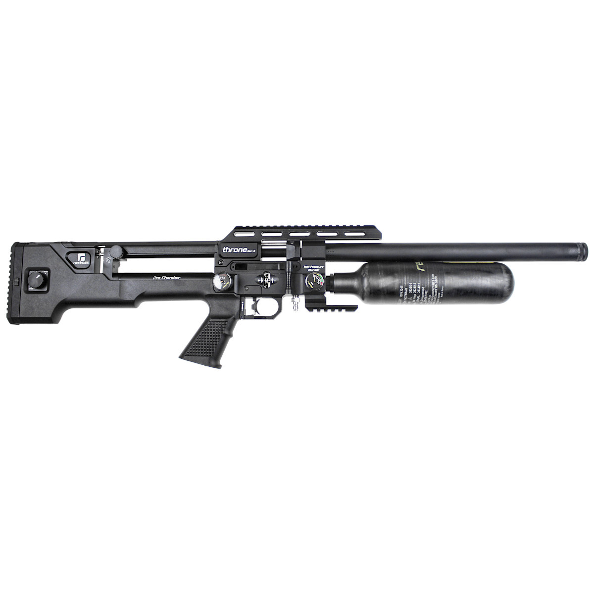 Reximex Throne Gen2 Carbon, nowoczesna wiatrówka PCP w znanej z przesunięcia komory i magazynika za spust wersji Bullpup lekkim kartuszem z włókna węglowego. Poprzez zastosowanie układu bezkolbowego, uzyskano kompaktowe wymiary karabinu, przy zachowaniu normalnej długości lufy gwarantującej celność i zasięg oraz typową dla tej konstrukcji redukcję wagi dla lepszej kontroli. Throne Gen2 wyposażono w dźwignię napinania Side Lever, regulator mocy strzału, pokrętło regulacji mechanizmu spustowego oraz lufę ze zintegrowanym tłumikiem dźwięku. Dostępny w kalibrach: .177 (4.5 mm), .22 (5.5 mm), .25 (6.35 mm).