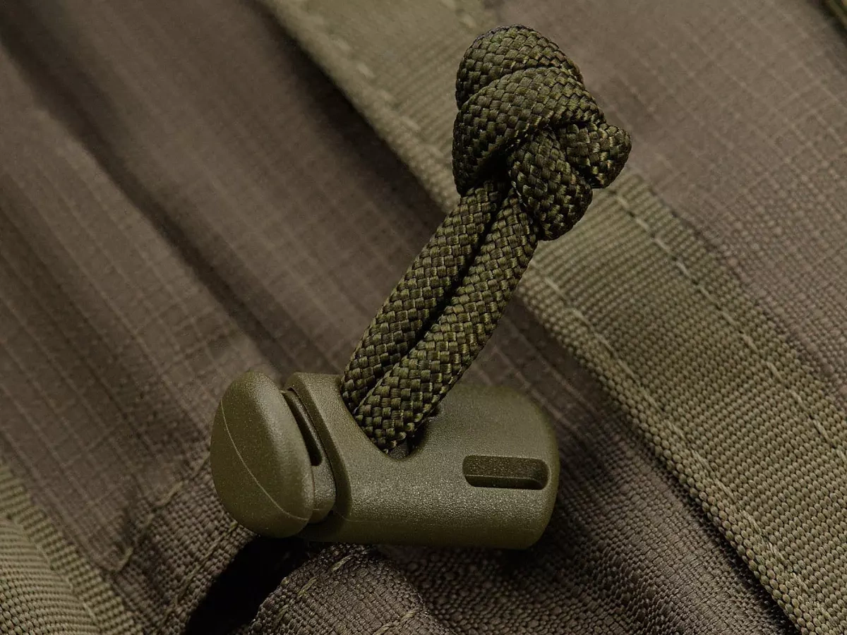 Duża kieszeń wewnętrzna wyposażona w zestaw elastycznych taśm do mocowania m.in. noża, latarki, multitoola. Otwierana pod kątem 90 stopni, dzięki lince paracord z punktową regulacją. Dodatkowa przednia płaska kieszeń na dokumenty lub mniejsze akcesoria. Komora główna oraz kieszeń przednia zasobnika zapinane zamkami YKK®. Zamki zakończono trokami ułatwiającymi obsługę również w rękawicach.