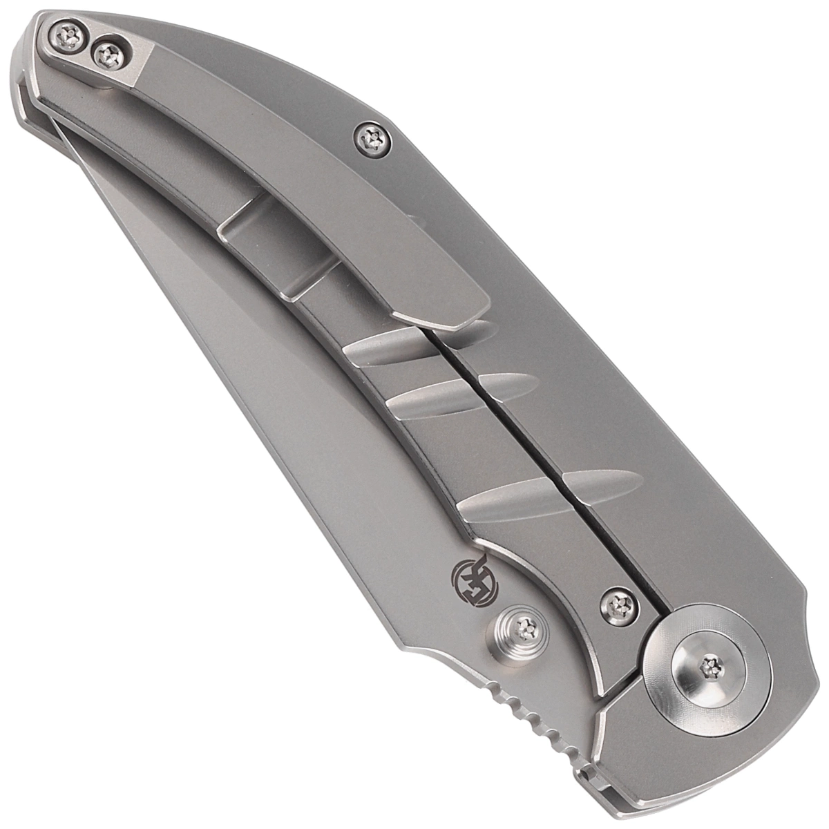 Rękojeść - ze szkiełkowanego i polerowanego tytanu 6AL4V. Konturowanie okładek eliminuje ostre krawędzie. Okładziny połączono ze sobą przy pomocy tytanowego backspacera. Górna część backspacera z szeroko rozmieszczonymi "ząbkami". Tekstura i frezowanie powierzchni polepszają pewność uchwytu. Prostota i solidność konstrukcji dają pewność wieloletniego użytkowania. Klips jednopozycyjny (prawa), wykonany z tytanu, umożliwia przenoszenie noża w pozycji tip-up.