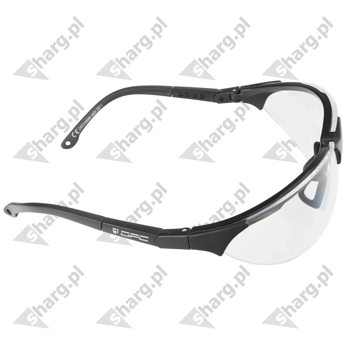Tactic Hawk Matt Black / Clear okulary ochronne o półramkowej konstrukcji oprawek i z przeźroczystymi soczewkami o podwyższonej wytrzymałości. Dzięki zastosowaniu innowacyjnych rozwiązań, okulary spełnią oczekiwania nawet najbardziej wymagających użytkowników. Pozbawione dolnej ramki oprawki, zwiększają zakres dolnego pola widzenia, umożliwiając użytkownikowi lepszą percepcję otoczenia. Ruchomy, wentylowany silikonowy nosek pozwala na łatwe dopasowanie okularów do kształtu twarzy, zapewniając pewne i stabilne osadzenie. Okulary dobrze współpracują ze słuchawkami, ochronnikami słuchu oraz nakryciami głowy czapkami i hełmami. Otwory na końcach zauszników przeznaczone są do mocowania paska zabezpieczającego. Wysoki filtr UV400 chroni wzrok przed szkodliwym promieniowaniem słonecznym UVA, UVB, UVC.