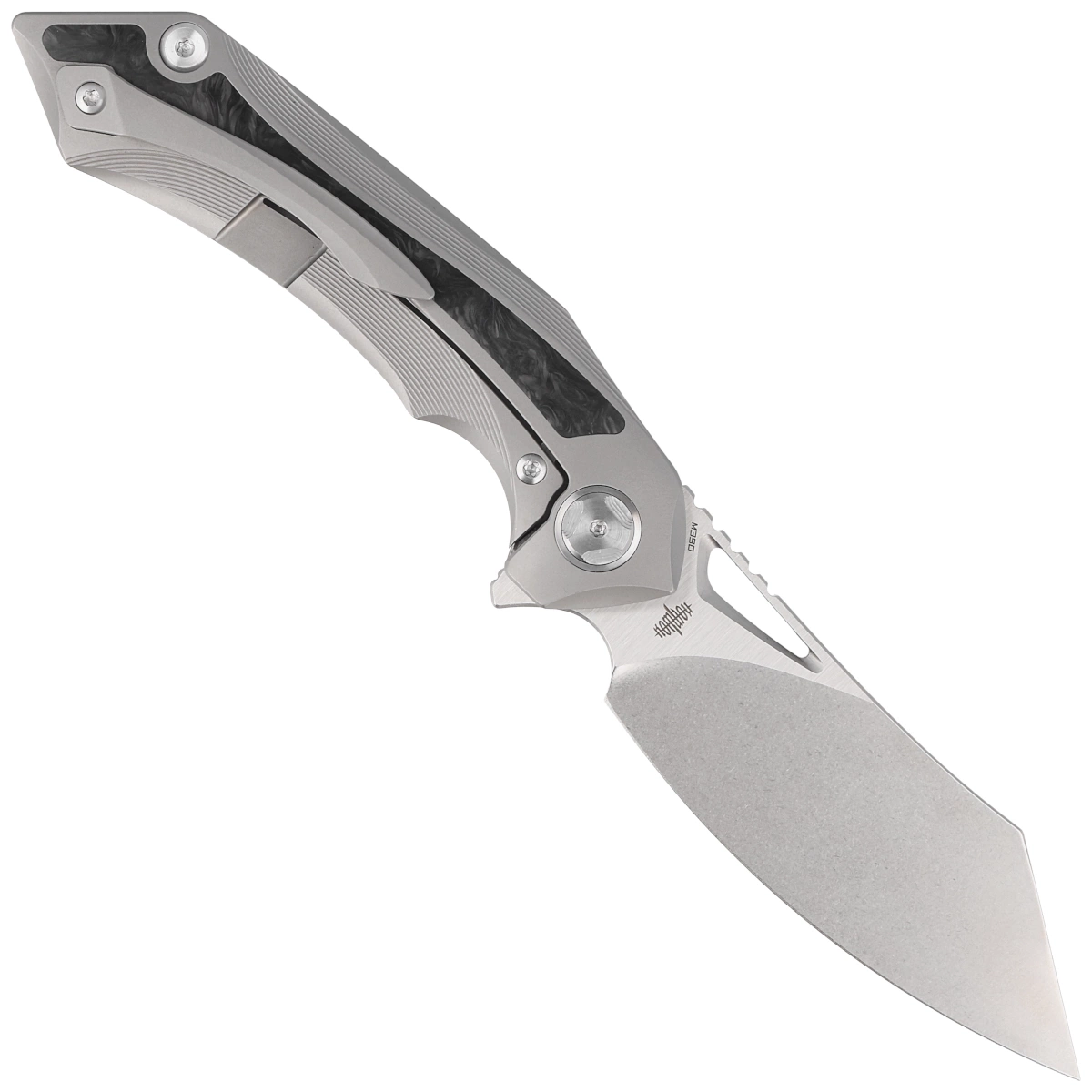 Rękojeść - to dwa kawałki litego tytanu 6AL4V z efektownymi marmurkowymi wstawkami z Marble Carbon Fiber. Schodkowo fazowane krawędzie okładek eliminują ostre ranty dla wygody i poprawiają pewność uchwytu. Masywny tytanowy backspacer do którego przymocowano okładziny gwarantuje sztywność i wytrzymałość całej konstrukcji. Jednopozycyjny, prawostronny tytanowy klips umożliwia przenoszenie noża w pozycji tip-up, czubkiem ostrza ku górze.