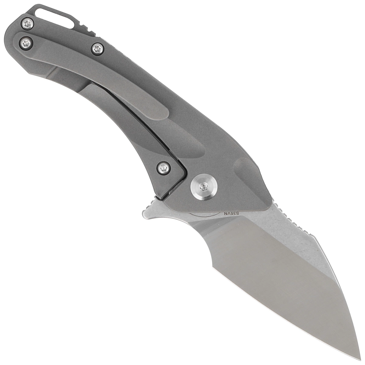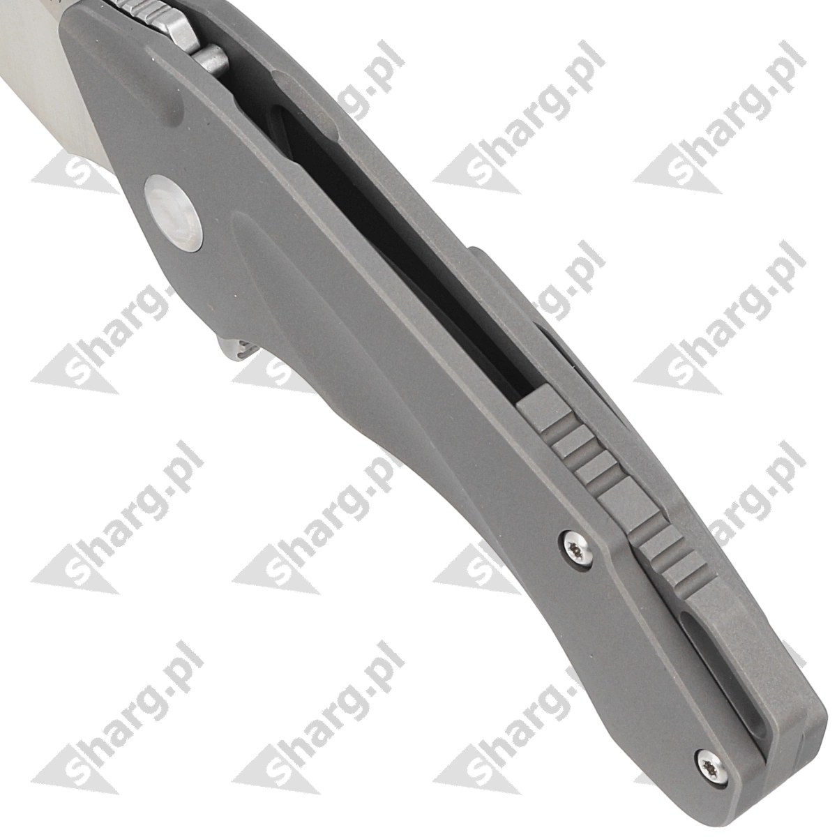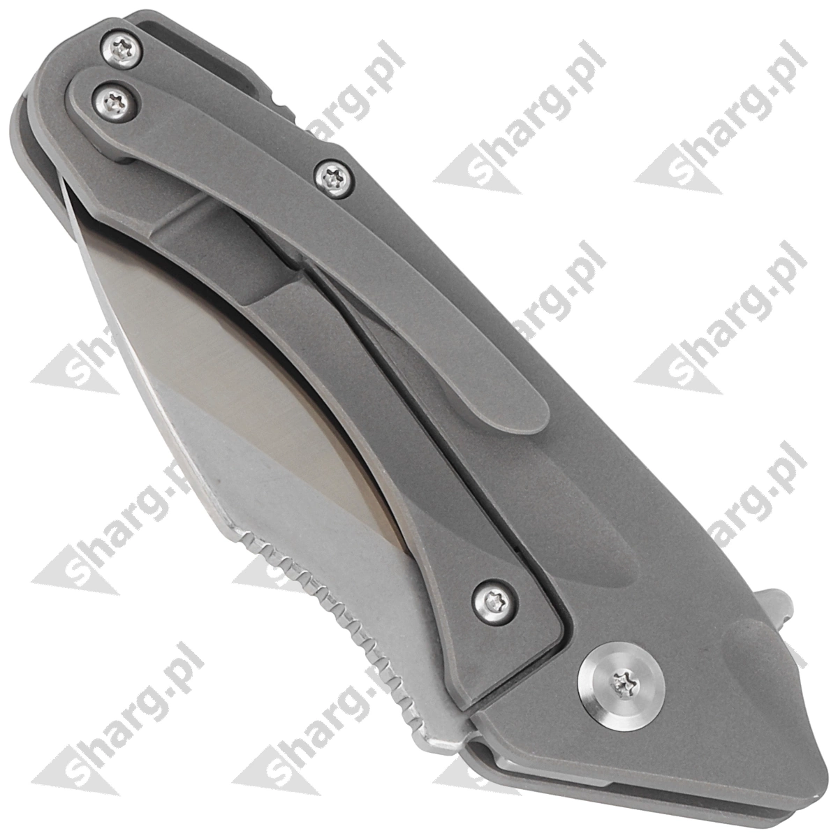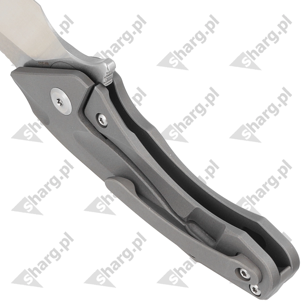 Rękojeść - okładziny z litego tytanu 6AL4V. Fazowane krawędzie okładek eliminują ostre ranty dla wygody i poprawiają pewność uchwytu. Masywny tytanowy backspacer do którego przymocowano okładziny gwarantuje sztywność i wytrzymałość całej konstrukcji. Profilowane wgłębienia na okładzinach poprawiają ergonomię. Jednopozycyjny, prawostronny tytanowy klips umożliwia przenoszenie noża w pozycji tip-up, czubkiem ostrza ku górze.