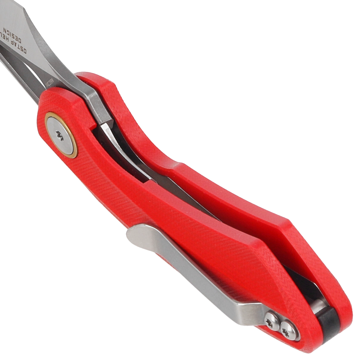 Rękojeść - okładziny z czerwonego G10 (włókno szklane prasowane pod ciśnieniem z żywicą syntetyczną) przykręcono do czarnego backspacera, również wykonanego z G10. Konturowanie okładek eliminują ostre krawędzie dla wygody i pewności uchwytu. Prosta, pewna konstrukcja daje pewność wieloletniego użytkowania. Klips stalowy, jednopozycyjny (prawa), umożliwia przenoszenie noża w pozycji tip-up (czubkiem do góry).
