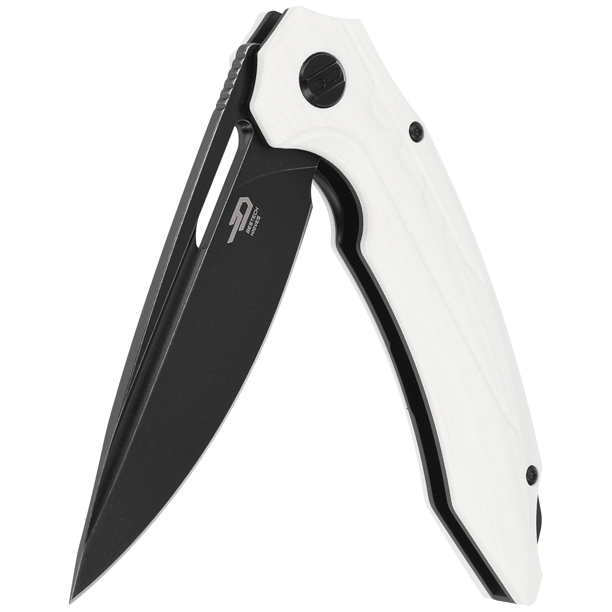 Rękojeść - mocno zakrzywiona rękojeść z białego kompozytu G10 (włókno szklane prasowane pod ciśnieniem z żywicą syntetyczną) zapewnia doskonały uchwyt w wielu pozycjach. Fazowane krawędzie okładek eliminują ostre krawędzie. Przykręcane do solidnego, stalowego backspacera, w jego górnej części otwór na linkę zabezpieczającą lub ozdobną. Oś pivota zdobi stylizowana litera "B". Jednopozycyjny, prawostronny klips deep carry pozwala przenosić dyskretnie nóż w kieszeni w pozycji tip-up (czubkiem ostrza do góry). Podcięcie na palec (fore finger groove) poprawia pewność uchwytu.