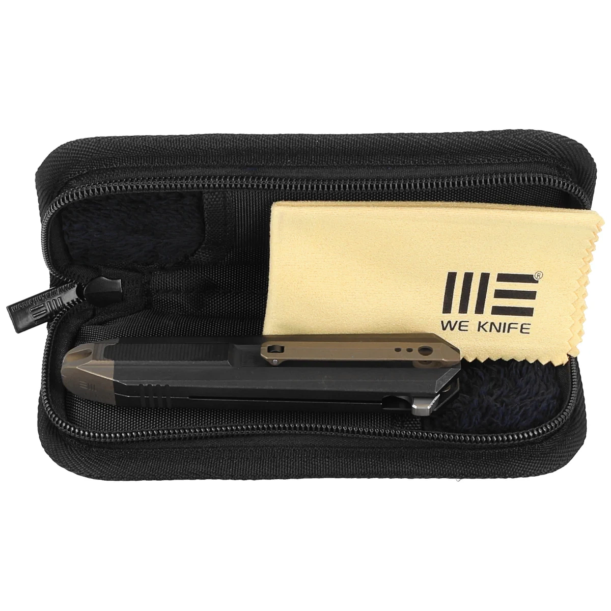 Rękojeść - to popis innowacyjności inzynierskiej projektantów z WeKnife. Dwa kawałki tytanu 6AL4V, pięknie frezowane łączy na końcu tytanowa nasadka z jednego kawałka tytanu. Dzięki temu rękojeść zachowuje niebywałą sztywność i odporność. Tylko nieliczne firmy są w stanie wykonać rękojeść z tak nieprawdopodobną dokładnością! Kolejna innowacja to umieszczone symetrycznie po obu stronach noża klipsy do przenoszenia. Koniec z odkręcaniem śrubek i przekładaniem, nóż możemy nosić po prawej i lewej stronie w tej samej pozycji. Dodatkowym smaczkiem jest zakończenie klipsów rolką, dzięki czemu ułatwione jest wsuwanie i zaczepianie noża o brzeg materiału. Nasadka i klipsy w kontrastującym do czerni kolorze brązu.