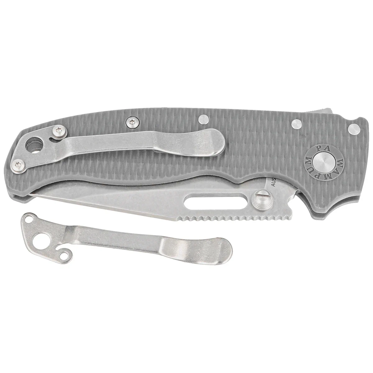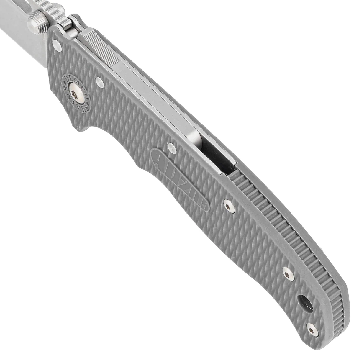 Rękojeść - okładziny z Grivory, praktycznie niezniszczalnego tworzywa niewrażliwego na warunki atmosferyczne, odpornego na chemikalia i uszkodzenia mechaniczne. Fazowane krawędzie okładek eliminują ostre ranty a charakterystyczne teksturowanie powierzchni poprawia pewność uchwytu. Jednopozycyjny, prawostronny klips umożliwia przenoszenie noża w pozycji tip-up, czubkiem ostrza ku górze. W zestawie dodawany jest klips dla leworęcznych.