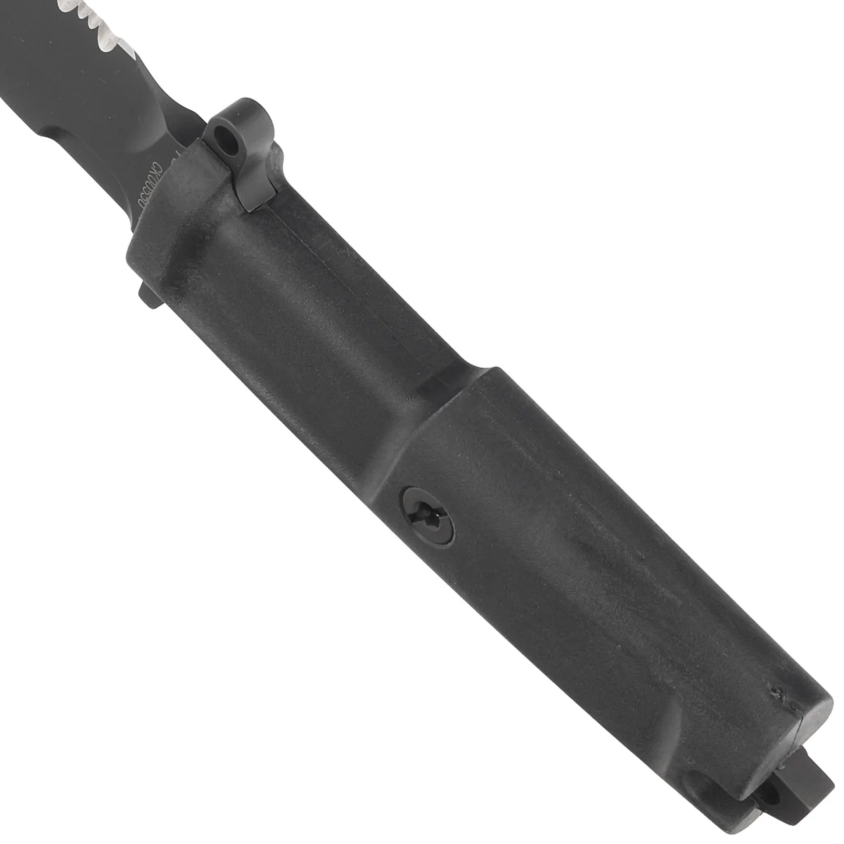 Pochwa - z formowanego wtryskowo nylonu w kolorze czarnym, umożliwia bezpieczne przenoszenie jak i szybkie dobycie noża. Trzy możliwości ustawienia kąta przenoszenia etui (poziomo, pionowo i ukośnie pod kątem 45°). Kaburę wyposażono w pojedyncze, automatyczne, aktywowane naciskiem zabezpieczenie, dla szybkiego chwytania i dobycia noża. Mocowanie kabury umożliwia jej szybkie przypięcie /wypięcie. Pasuje do pasów o szerokości 32-46 mm, a po wyjęciu regulacji również do większości pasów policyjnych. W celu uniknięcia przesuwania się pochwy na pasie, uchwyt wyposażono w dwie śruby regulacyjne.