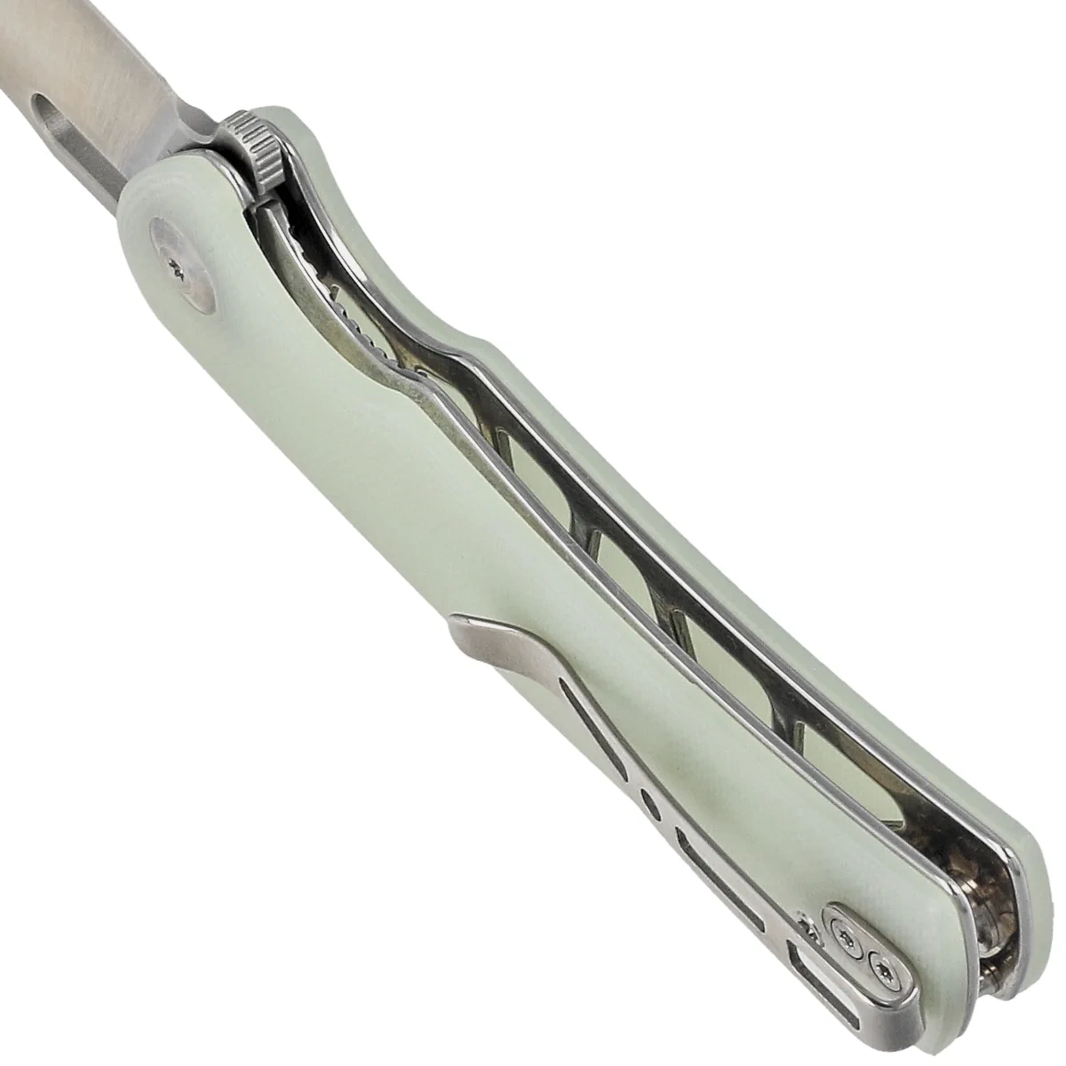 Głownia - typu Drop Point o wyraźnie zaznaczonym brzuchu, wykończona eleganckim satynowaniem. Niewielka grubość klingi w połączeniu z wysokim, płaskim szlifem daje doskonałą geometrię krawędzi tnącej oraz ekstremalną wydajność cięcia. Ceramiczne łożyska kulkowe wspomagają płynną pracę mechanizmu otwierającego klingę, którą można otworzyć za pomocą szybkiej płetwy flippera (index-finger flipper) oraz podłużnego otworu w klindze. Po otwarciu płetwa tworzy mini-gardę zapobiegającą ześlizgnięciu się dłoni na ostrze. Całość blokowana jest solidną blokadą Liner Lock.