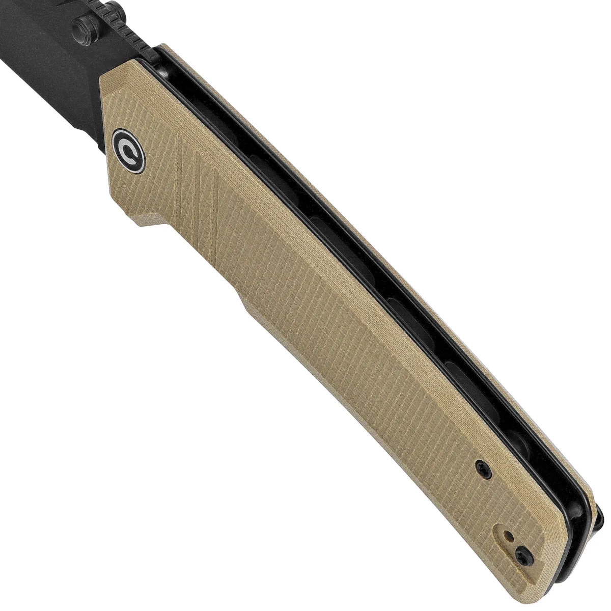 Rękojeść - wykonana z tworzywa G10, kompozytowego materiału z włókna szklanego prasowanego pod ciśnieniem z syntetyczną żywicą. Fazowane krawędzie okładek eliminują ostre krawędzie a teksturowana powierzchnia zwiększa wygodę i pewność uchwytu. Otwarta konstrukcja tzw. open-backed mocowana stalowymi tulejami dystansowymi redukuję wagę oraz ułatwia czyszczenie. Oś pivota zdobi stylizowane logo marki Civivi. Dwupozycyjny, prawo/lewostronny klips deep carry pozwala przenosić dyskretnie nóż w kieszeni w pozycji tip-up (czubkiem ostrza ku górze).