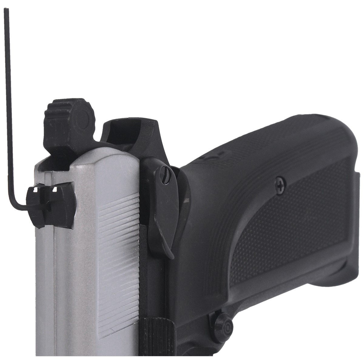 Przyrządy celownicze - polimerowe, stała muszka oraz regulowana szczerbinka. Naniesione plamki w białym kontrastującym kolorze ułatwiają celowanie w warunkach ograniczonej widoczności.