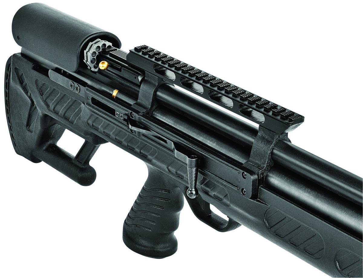 • Bull Boss mocna wiatrówka Hatsan. Dzięki zastosowaniu układu bezkolbowego uzyskano kompaktowe wymiary karabinu przy zachowaniu normalnej długości lufy gwarantując doskonałą celność, zmniejszony podrzut. Precyzyjna lufa Hatsan QE ze zintegrowanym tłumikiem
