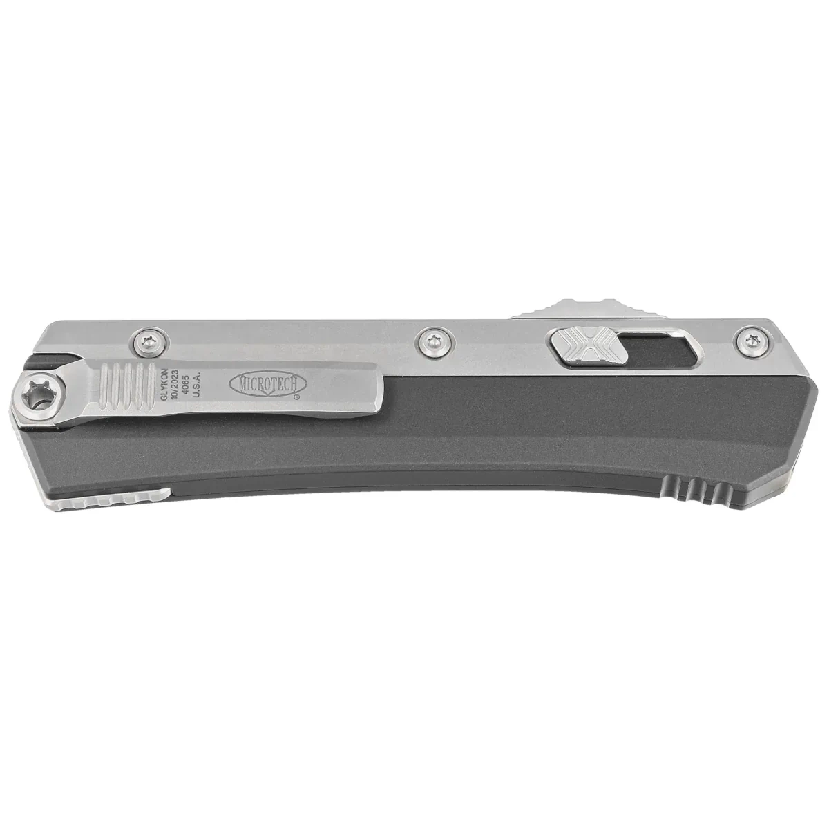 Rękojeść - wykonana z doskonałą precyzją w technologii 3D na frezarkach CNC, dolna część z anodyzowanego na czarno aluminium 6061-T6, górna część z piaskowanego tytanu. Faktura powierzchni rękojeści powoduje, że nóż nie ślizga się w dłoni podczas używania. Na grzbiecie i dole rękojeści znajdują się nacięcia (jimping) dla pewniejszego chwytu. Ergonomiczny profil oraz frezowany dwupozycyjny (prawa/lewa) masywny klips typu deep carry, umożliwiają dyskretne przenoszenie noża w kieszeni, w pozycji tip-down (czubkiem ostrza do dołu). Na klipsie znajduje się logo Microtech, numer seryjny i data produkcji.