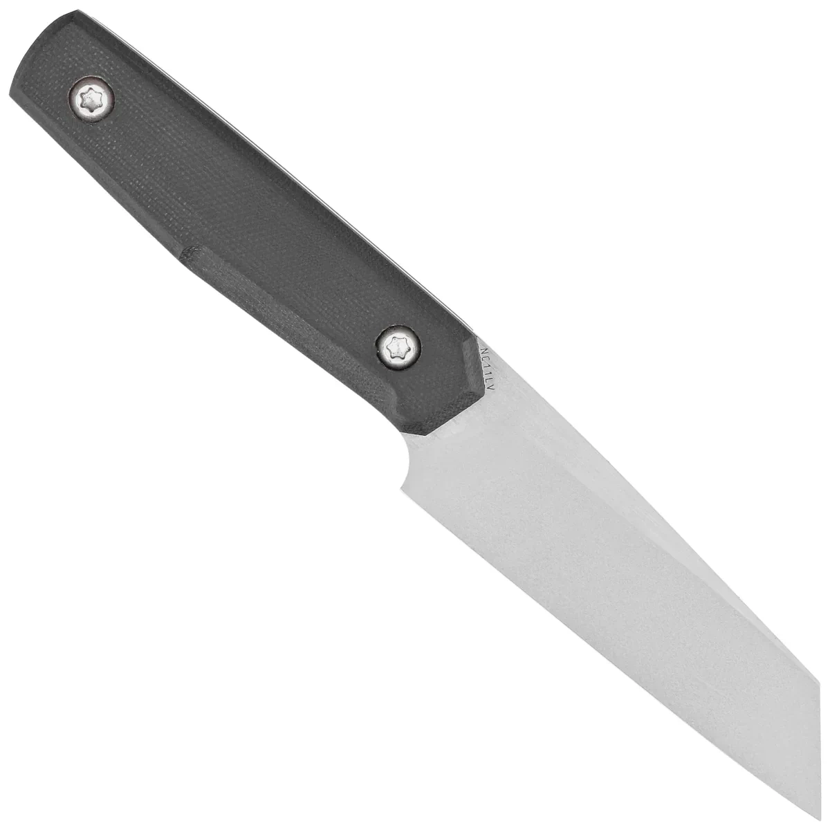 Głownia - niezwykle ostra o profilu Wharncliffe, geometryczny kształt jest idealny do wszelkich prac. Wykończone eleganckim satynowaniem ostrze Plain wyprowadzono wysokim szlifem płaskim (Flat Grind), wysoki szlif daje doskonałą geometrię krawędzi tnącej oraz ekstremalną wydajność cięcia. Wydłużona "broda" chroni dłoń przed zsunięciem się na ostrze.