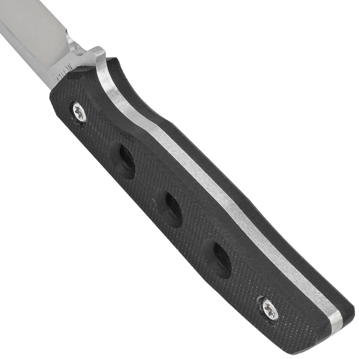 Rękojeść - pokryta wytrzymałymi okładzinami z G10 (włókno szklane prasowana pod ciśnieniem z żywicą syntetyczną) w kolorze czarnym, o lekko chropowatej powierzchni. Zapewniają doskonałą ergonomię oraz pewny uchwyt. Symetryczna konstrukcja rękojeści umożliwia trzymanie noża w obie strony, specjalnie dla użytkowników, ceniących odwrócony chwyt. Seria otworów nie tylko wizualnie nadaje lekkości rękojeści, ale odejmuje również realną wagę noża.