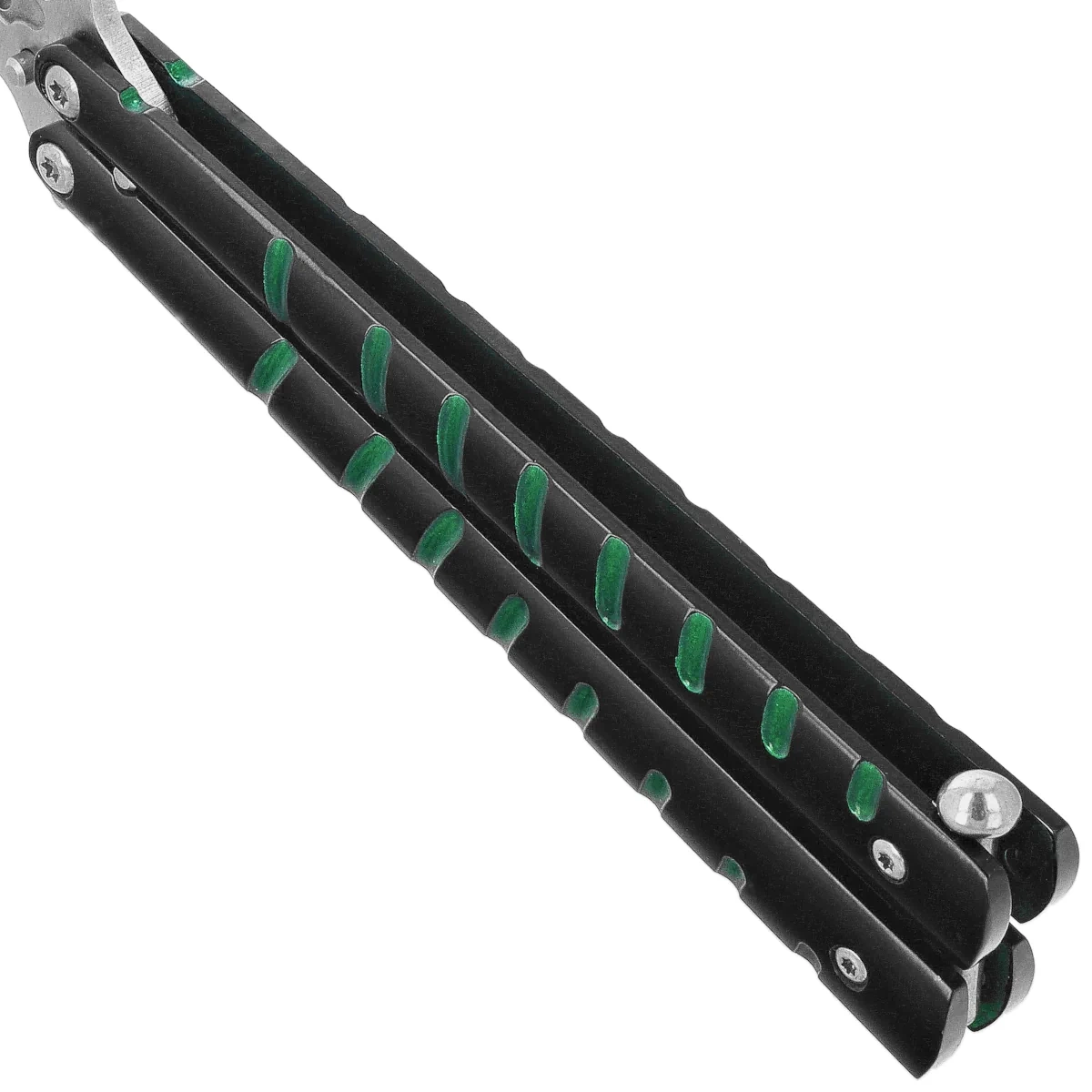 3. Praktyczność: Składana konstrukcja motylka sprawia, że Balisong Black / Green Stainless Steel, Satin jest łatwy do przenoszenia i przechowywania.