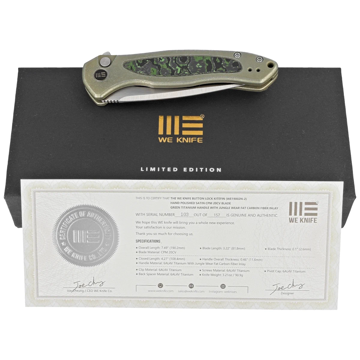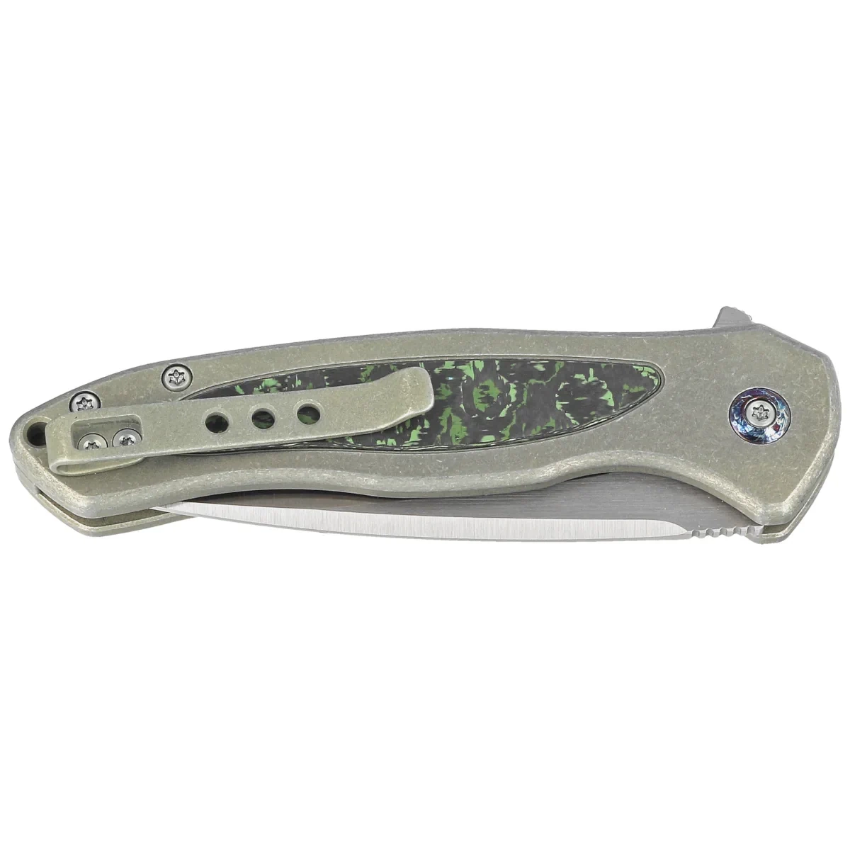 Nóż składany WE Knife Button Lock Kitefin LE No 103/157 Green Titanium/Jungle Wear Fat Carbon, Hand Polished Satin CPM 20CV (WE19002N-2)