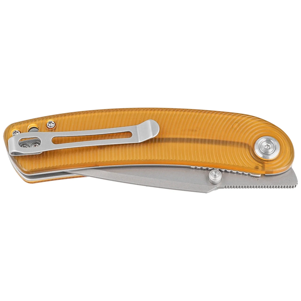 Rękojeść - okładziny z przezroczystego tworzywa Ultem™, teksturowane dla poprawienia pewności uchwytu, przykręcono do stalowej ramy noża. Otwarta konstrukcja tzw. open-backed bez typowego backspacera, mocowana do siebie stalowymi tulejami dystansowymi ułatwia czyszczenie. Prosta, solidna konstrukcja daje pewność wieloletniego użytkowania. Pivot ozdobiony stylizowanym logo producenta. Dwupozycyjny (prawa/lewa) stalowy klips deep carry pozwala przenosić dyskretnie nóż w kieszeni w pozycji tip-up (czubkiem ostrza do góry). Nad klipsem lanyard hole, otwór do przewleczenia linki zabezpieczającej lub ozdobnej.