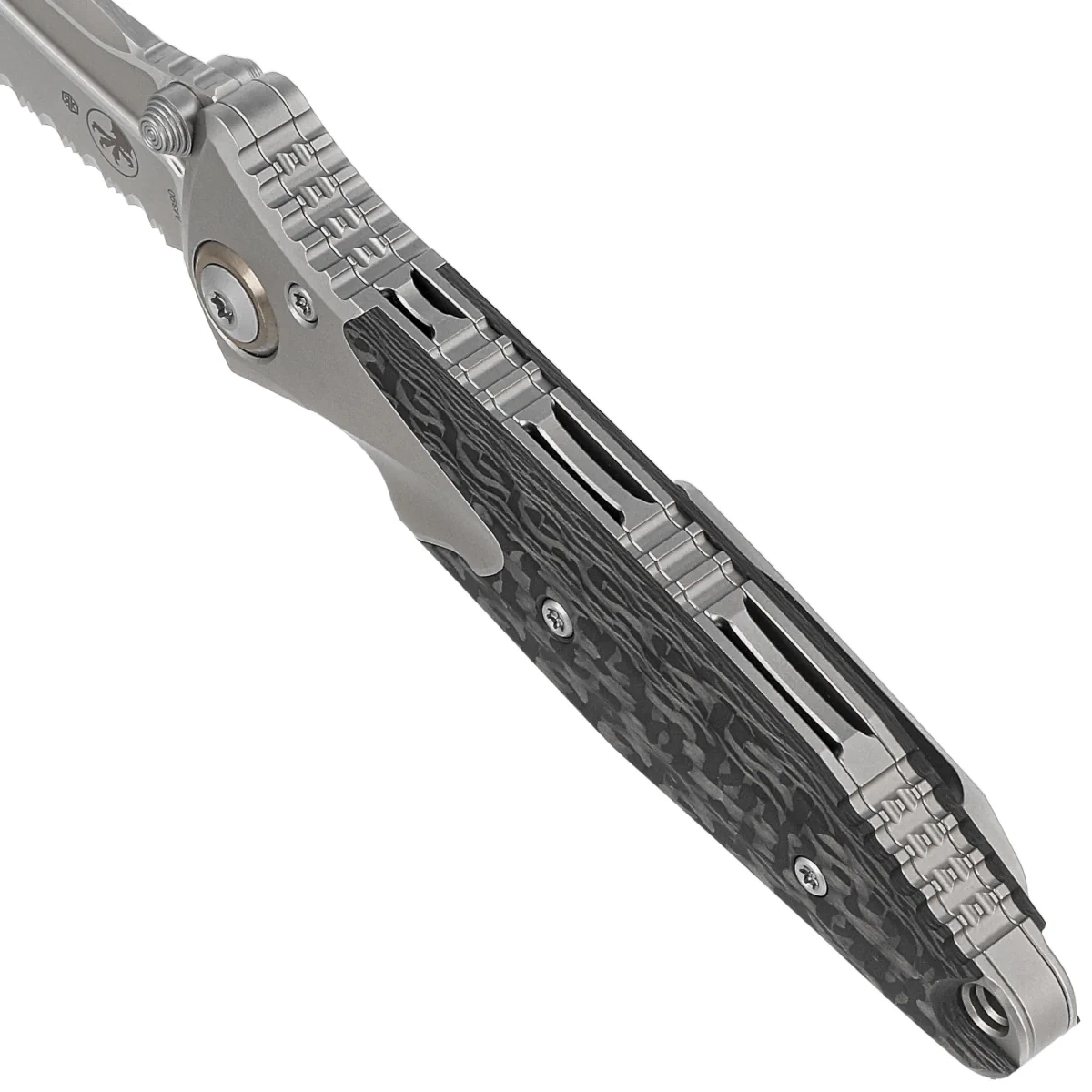 Rękojeść - wykonana z doskonałą precyzją w technologii 3D na frezarkach CNC z tytanu. Perfekcyjnie spasowane wkładki (inlay) z kompozytu Carbon Fiber powodują, że nóż nie ślizga się w dłoni podczas używania. Na grzbiecie rękojeści znajdują się nacięcia (jimping) dla pewniejszego chwytu. Ergonomiczny profil oraz frezowany jednopozycyjny (prawa) masywny klips, umożliwiają dyskretne przenoszenie noża w kieszeni, w pozycji tip-up(czubkiem ostrza do góry). Oś pivota ozdobiona obręczą w kolorze brązu (pivot collar cap). W tylnej części znajduje się lanyard hole, miejsce na linkę zabezpieczająca lub ozdobną. Wystający fragment tytanowego szkieletu może służyć jako improwizowany zbijak do szyb.