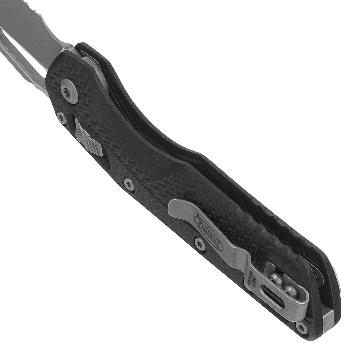 Rękojeść - wykonana z wytrzymałego polimeru, dla lepszego uchwytu pokryta fakturą Tri-Grip. Szeroki suwak blokady z charakterystyczną dla firmy Microtech schodkową strukturą X. Obie okładziny zostały skręcone przy pomocy solidnego, aluminiowego backspacera. Dwustronny (prawa / lewa) klips pozwala dyskretnie nosić nóż w pozycji tip-up. Nad klipsem lanyard hole, miejsce na linkę zabezpieczającą lub ozdobną.