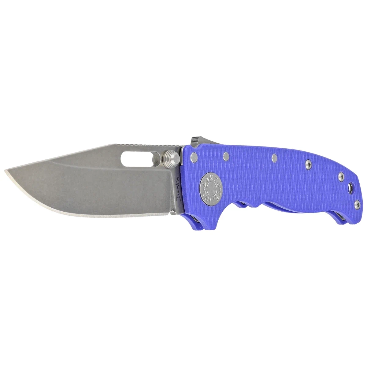 Głownia - typu Clip Point, wykończona maskująca rysy kąpielą w drobnych kamykach Stonewashed. Brzusiec wydłuża długość krawędzi tnącej w stosunku do długości smukłej klingi zbiegając się w kierunku ostrego jak igła czubka noża. Grubość klingi zapewnia wysoką wytrzymałość podczas gdy wysoki, płaski szlif daje doskonałą geometrię krawędzi tnącej oraz ekstremalną wydajność cięcia. Łożyska kulkowe wspomagają otwarcie ostrza za pomocą obustronnego kołka w klindze (dual thumb stud) lub owalnego otworu (thumb hole). Całość blokowana jest uznawaną za najmocniejszą na świecie blokadą Shark-Lock™.