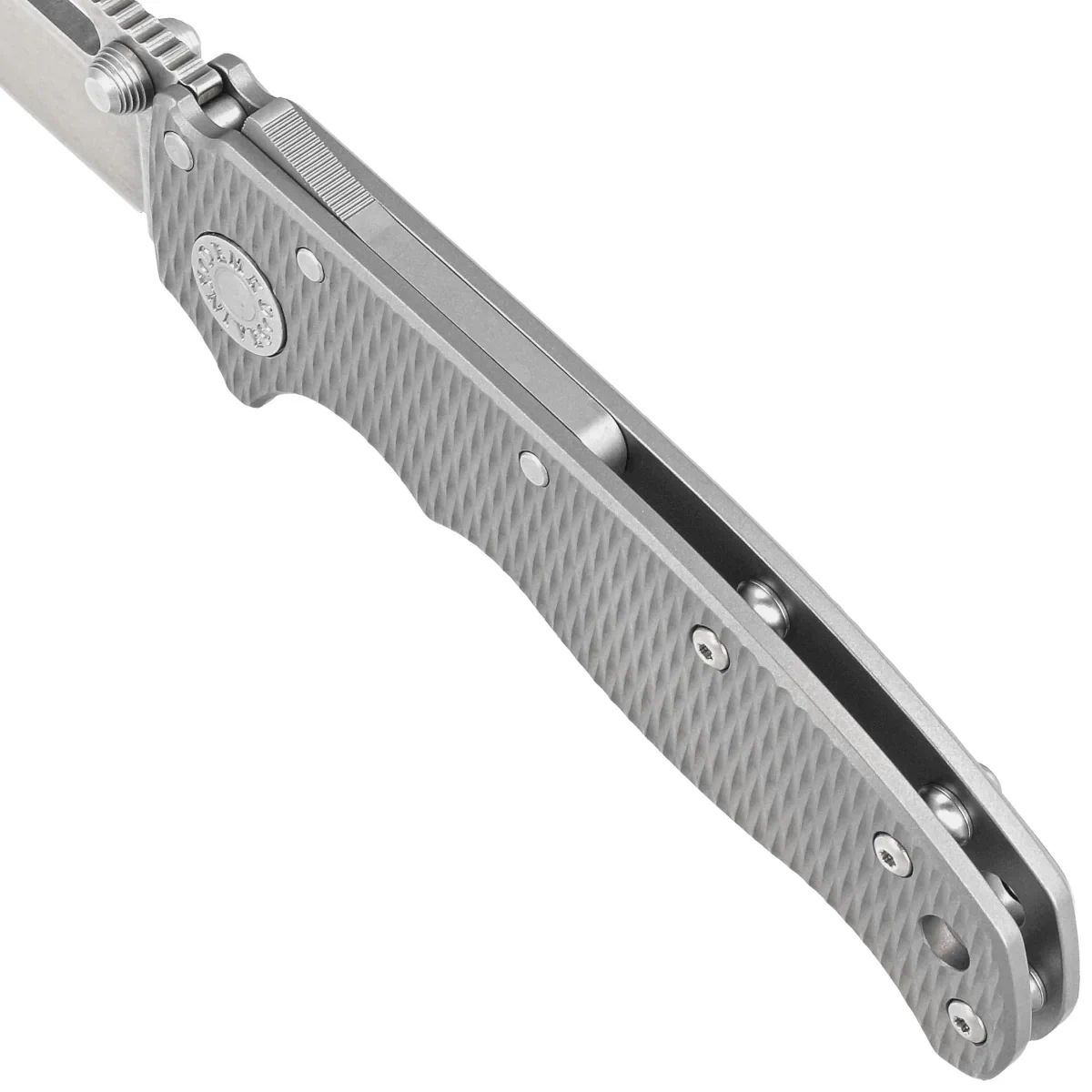 Rękojeść - wykonana z tytanu 6AL4V o lekko szorstkiej fakturze i wykonanym na obrabiarkach CNC wzorze na rękojeści. Fazowane krawędzie okładek eliminują ostre krawędzie dla wygody, a wykonane z przodu podcięcie na palec (fore finger groove) poprawia pewność uchwytu. Jednopozycyjny, prawostronny klips umożliwia przenoszenie noża w pozycji tip-up, czubkiem ostrza ku górze. W zestawie dodawany jest klips dla leworęcznych.