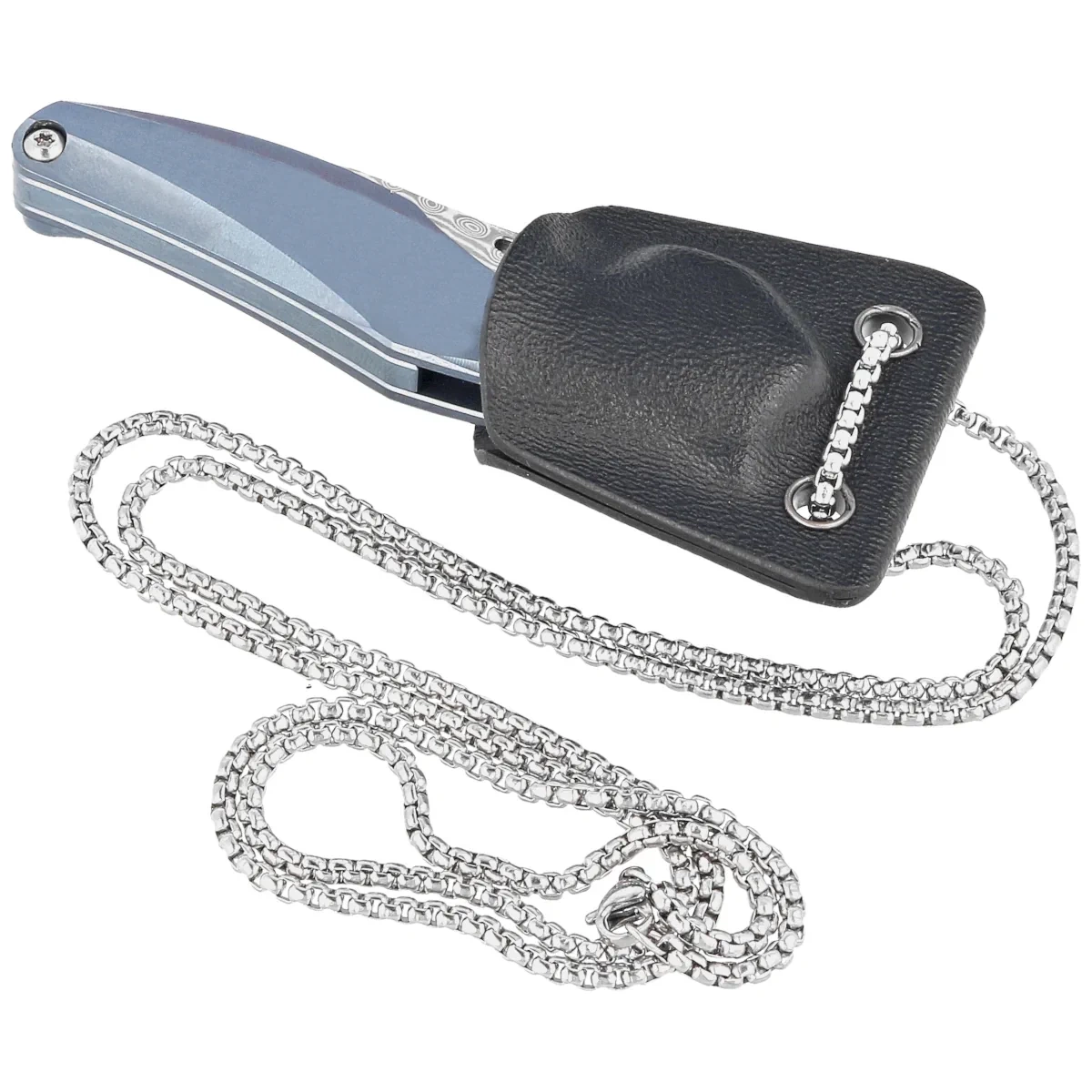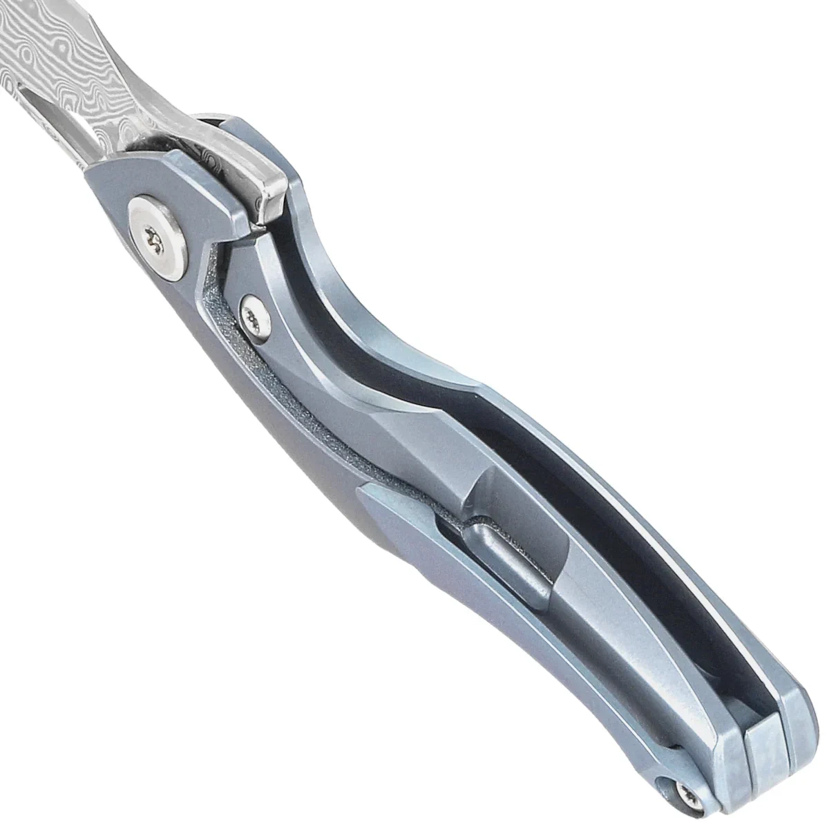 The Reticulan Blue Titanium, Damascus nieduży, elegancki nóż składany z pochwą przystosowaną do zawieszania na szyi. Projekt znanego knifemakera i designera Elijah IshamaWygląd The Reticulan wyraźnie podkreśla styl projektowania Elijah Ishama. Jego projekty są często wzbogacone o artystyczne organiczne kształty i faliste linie. Bez wątpienia The Reticulan to niezwykły nóż, który wyróżni Cię z tłumu!