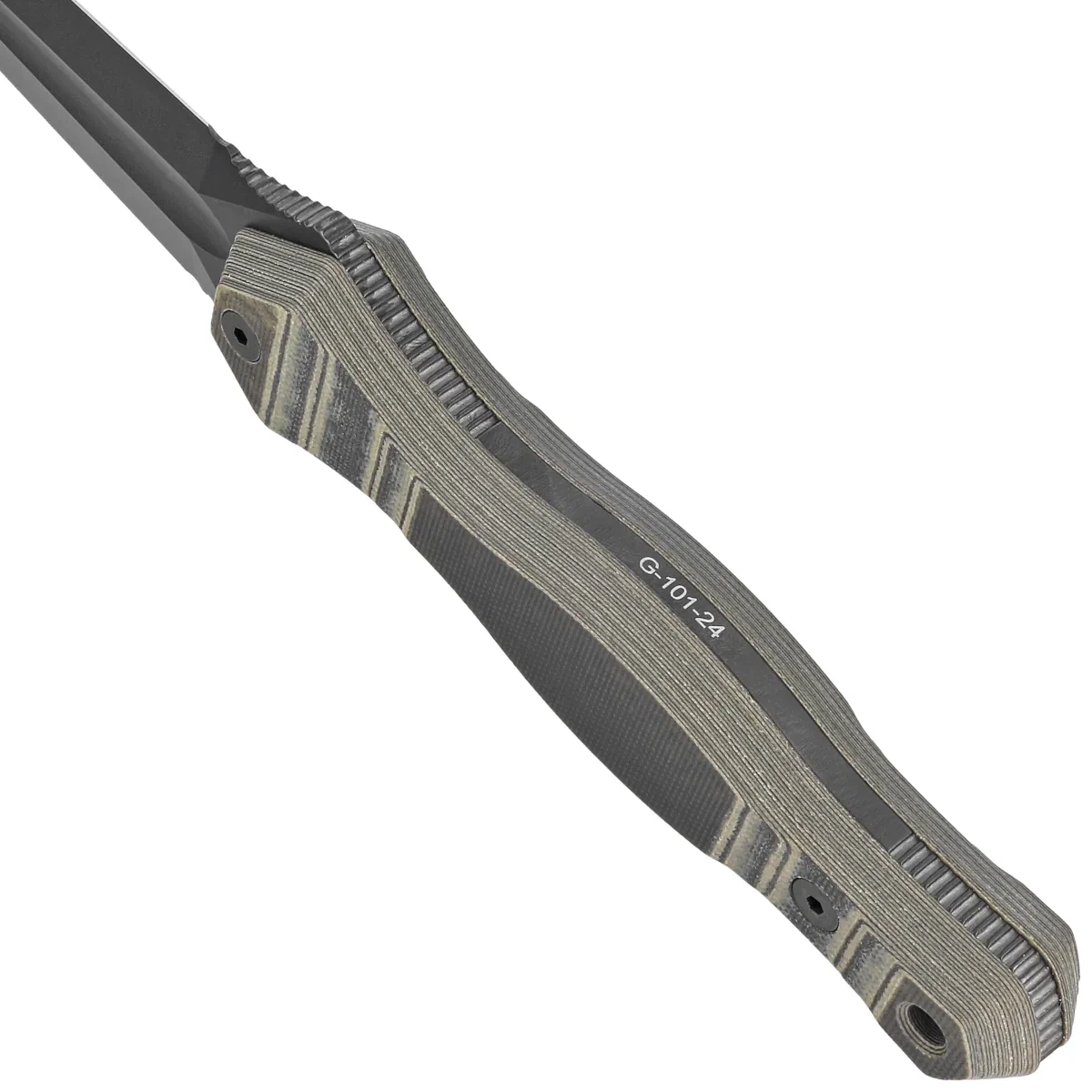Golak Black/Olive G10, Black DLC Limited Edition - wyjątkowy nóż o stałej głowni, który jest hołdem dla żołnierzy armii czeskiej uczestniczących w misji pokojowej w Kosowie. Limitowany model został zaprojektowany przez weterana, Romana Hippika i wykonany z najwyższej jakości stali Böhler N690, znanej ze swojej wytrzymałości, odporności na korozję i długiego trzymania ostrości. Głownia noża jest pokryta powłoką DLC (Diamond-Like Carbon), która zwiększa odporność na korozję i zarysowania. Rękojeść wykonana z G10 w kolorze czarno-oliwkowym nie tylko dodaje nożowi eleganckiego wyglądu, ale także zapewnia pewny chwyt nawet w najtrudniejszych warunkach. Nóż jest dostarczany z pochwą wykonaną z kydexu, lekką, wytrzymałą i odporną na warunki atmosferyczne. Każdy nóż jest unikalny i posiada indywidualny numer seryjny oraz rok produkcji. Połączenie elegancji i funkcjonalności, wyrafinowany design, inspirowany kształtem bałkańskich sztyletów i noża szturmowego wz. 85 używanego przez żołnierzy w misjach na Bałkanach, to nie tylko praktyczne narzędzie, ale także doskonały wybór dla tych, którzy cenią sobie jakość, funkcjonalność i unikalny design.