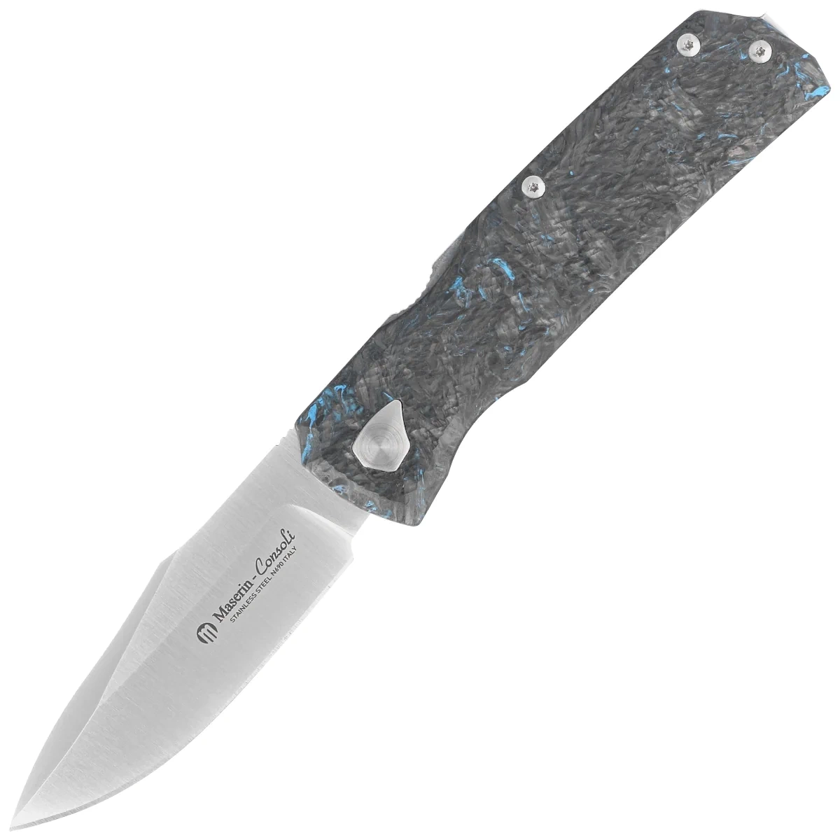 502 Power Black/Blue FatCarbon, Satin, wyjątkowy nóż, który jest wynikiem współpracy włoskiego knifemakera Sergio Consoli z firmą Maserin. Głownia wykonana z popularnej w branży nożowej stali Böhler N690 znanej z niezwykłej trwałości i odporności na zużycie, a jednocześnie zachowującej ostrość przez długi czas. Rękojeść wykonana z FatCarbon, materiału o wyjątkowej wytrzymałości i estetyce. System blokady W-Lock zapewnia bezpieczeństwo i łatwość obsługi. Lekki, zaledwie 90 gramów, wygodny do noszenia. Połączenie wysokiej jakości materiałów z doskonałym projektem, funkcjonalne narzędzie, ale także dzieło sztuki użytkowej. Wyrafinowany design i wysokiej jakości materiały sprawiają, że jest to produkt, który zasługuje na uwagę każdego miłośnika noży. Łączy w sobie niezrównaną jakość wykonania, wyjątkową funkcjonalność i elegancki design. To prawdziwy klejnot wśród noży, który zasługuje na miejsce w każdej kolekcji.