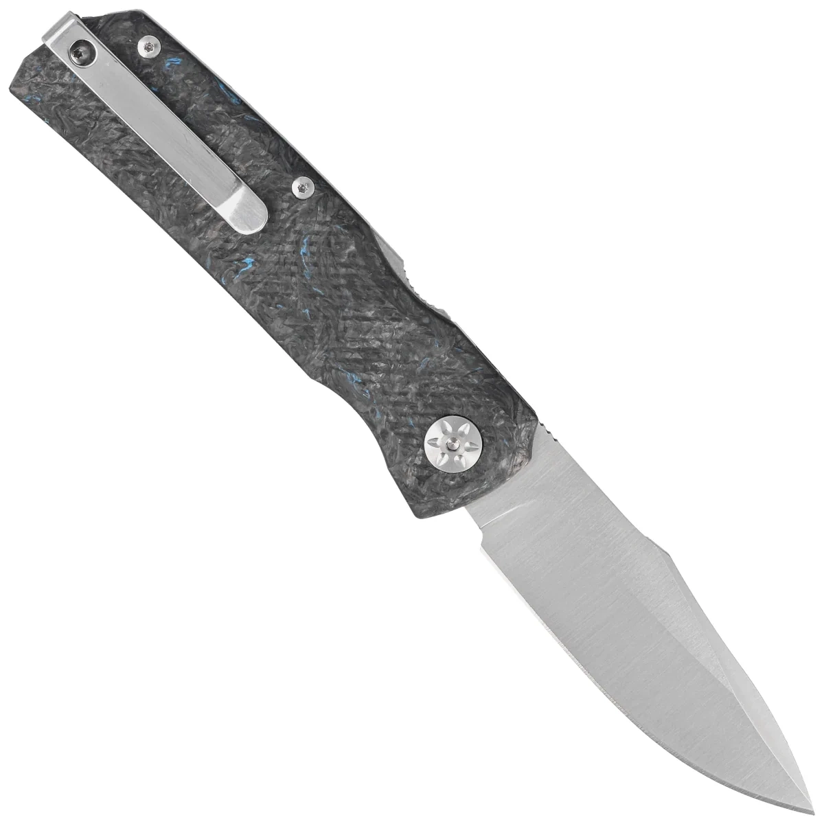 Rękojeść - okładziny z kompozytu Fat Carbon, materiału o wyjątkowej wytrzymałości i estetyce. Backspacer jest częścią systemu blokady W-Lock. Ozdobny pivot pięknie kontrastuje z kolorem okładzin. Wykonane z przodu podcięcie na palce (fore finger groove) poprawia pewność uchwytu, tworząc gardę zapobiegającą ześlizgnięciu się dłoni na ostrze. Jednopozycyjny, prawostronny klips umożliwia przenoszenie noża w pozycji tip-up, czubkiem ostrza ku górze.