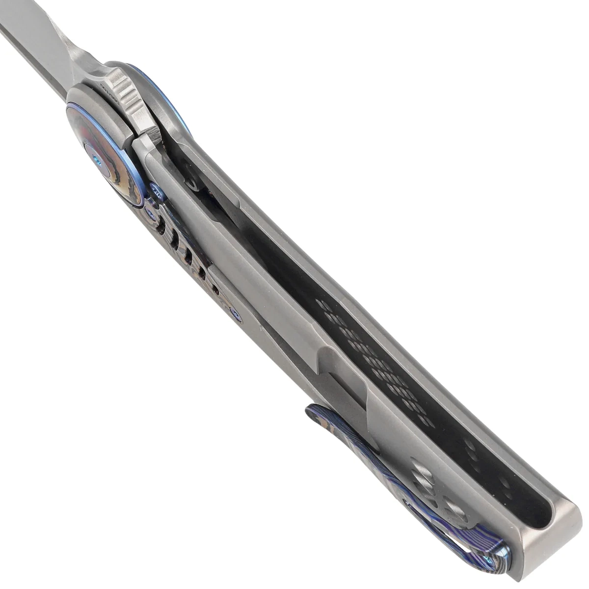 Rękojeść - wykonana z jednego kawałka tytanu 6AI4V, obrobionego na frezarkach CNC. Monolityczny korpus o najwyższej wytrzymałości, będący solidnym elementem konstrukcyjnym gwarantującym sztywność i wytrzymałość całej konstrukcji. Tylko nieliczne firmy są w stanie wykonać rękojeść z tak nieprawdopodobną dokładnością! Prostota i solidność konstrukcji dają pewność wieloletniego użytkowania. Klips jednopozycyjny (prawa), wykonany z Zircuti (damast z tytanu i cyrkonium), umożliwia przenoszenie noża w pozycji tip-up. Oś pivota ozdobiona niebieską obręczą (pivot collar cap) oraz kunsztownie wkomponowaną wkładką z Zircuti.