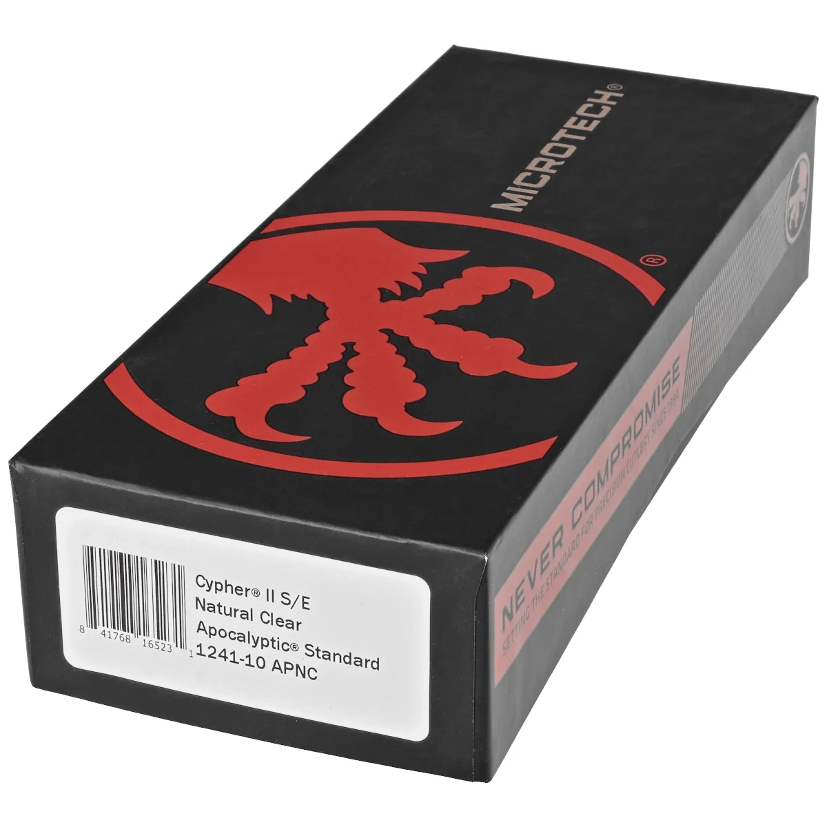 Cypher II S/E Natural Clear Aluminium, Apocalyptic to druga generacja legendarnego OTF (Out The Front) stworzonego we współpracy Anthony'ego Marfione i Deryka Monroe. Reprezentujący szczyt zaawansowanej technologii Cypher, przeszedł kompleksową modernizację. Innowacyjny podwójny mechanizm napędzający ostrze zapewnia płynniejszą pracę niż kiedykolwiek wcześniej w nożach OTF.
