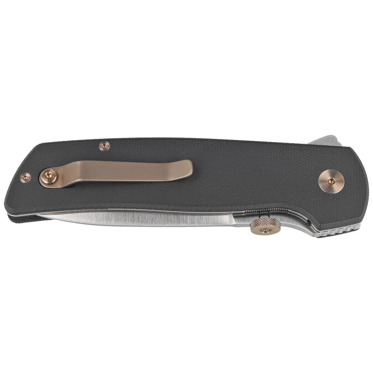 Rękojeść - fazowane okładziny z polerowanej Micarty, praktycznie niezniszczalnego tworzywa niewrażliwego na warunki atmosferyczne, odpornego na chemikalia i uszkodzenia mechaniczne, lekko profilowane. Masywny backspacer do którego przymocowano okładziny gwarantuje sztywność i wytrzymałość całej konstrukcji. Prosta, solidna konstrukcja daje pewność wieloletniego użytkowania. Jednopozycyjny (prawa) tytanowy klips pozwala przenosić dyskretnie nóż w kieszeni w pozycji tip-up (czubkiem ostrza do góry).