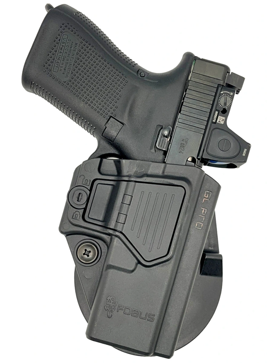 GL PRO otwarta kabura zewnętrzna OWB (Outside the Waist Band) izraelskiej firmy Fobus przystosowana do przenoszenia na pasie. Seria PRO stawia na bezpieczeństwo oraz wygodę użytkowania. Posiada blokadę dobycia broni z możliwością łatwego przełączenia między trybem aktywnym a pasywnym (z dodatkową regulacją siły docisku). Zaprojektowana do broni z zamontowanym kolimatorem oraz podwyższoną muszką. Wytrzymały polimer zabezpiecza broń przed uszkodzeniem. Zaprojektowana na nowo gumowana płetwa z wcięciem na pasek 45mm zapobiega przemieszczaniu się broni. Wersja dla osób praworęcznych.