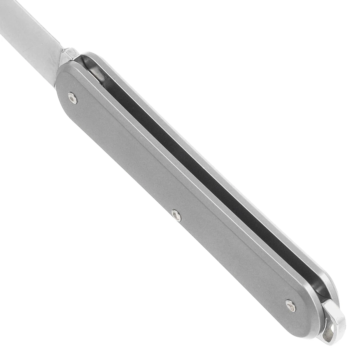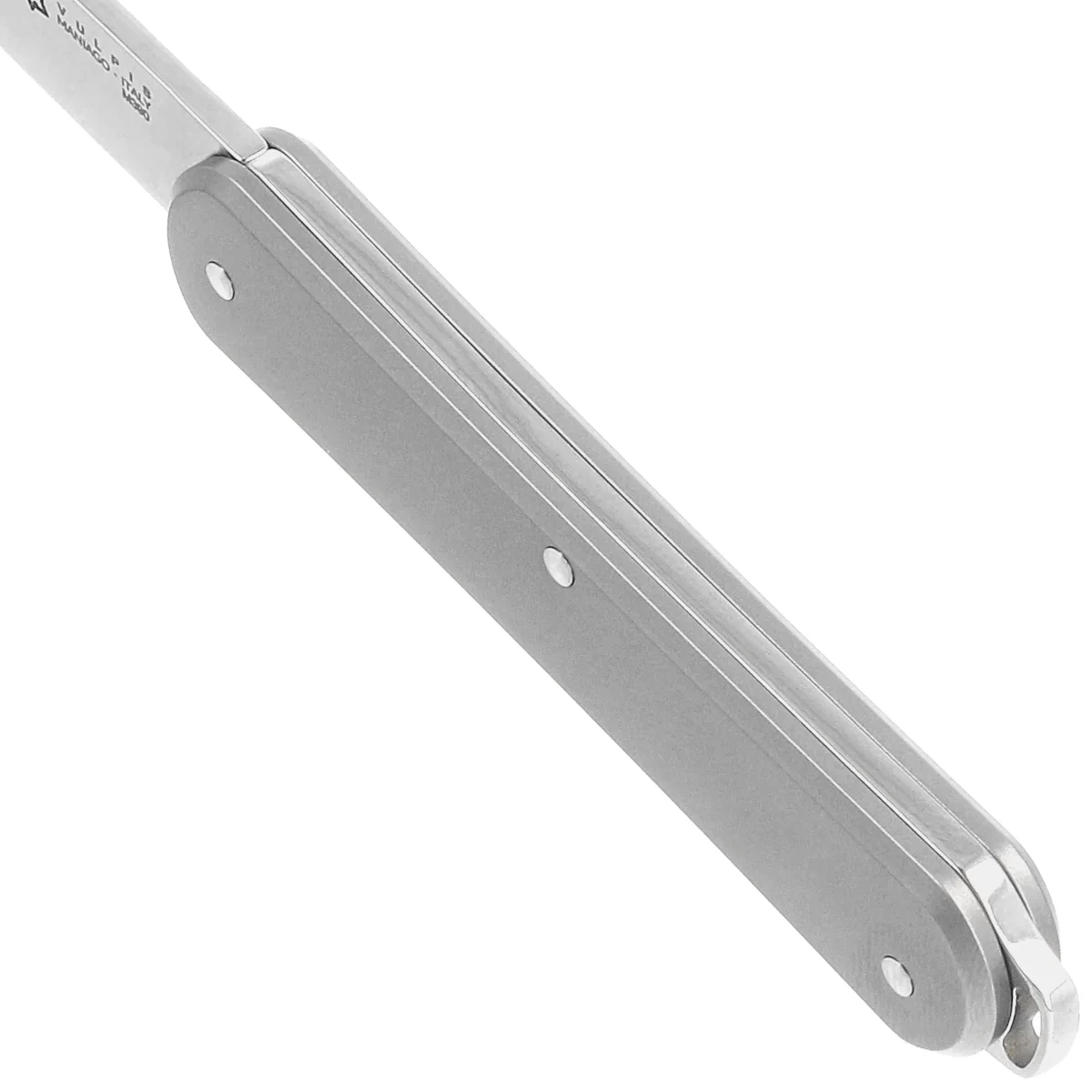 Rękojeść - okładziny w kolorze szarym. Wykonane z odpornego na działanie temperatur oraz uszkodzenia mechaniczne piaskowanego tytanu. Prosty kształt świetnie dopasowuje się do każdej dłoni. W tylnej części kółko do przewleczenia linki asekuracyjnej lub ozdobnej.