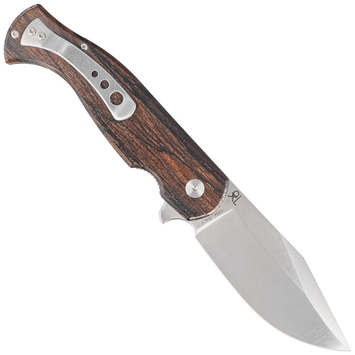 Eastwood Tiger Ziricote Wood, Satin niezwykle efektywny, pełnowymiarowy (full size)ny folder E.D.C. z głownią przeznaczoną do agresywnego użytkowania. Zaprojektowany dla użytkowników, którzy szukają niezawodności stałego ostrza, a nie chcą zrezygnować z kompaktowych rozmiarów noża składanego. Efekt współpracy knifemakera Gudy van Poppel'a z włoską marką Fox.