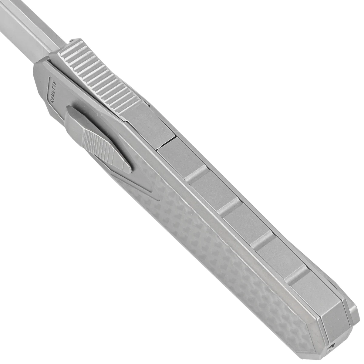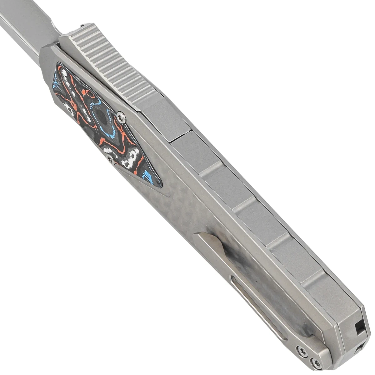 - Swordfish Titanium / Red Blue Carbon Fiber, Pearlescent. Innowacyjny nóż z młodej manufaktury Remette Knives. OTF z wysuwanym dzięki sile grawitacji ostrzem ze stali Böhler M390. Rękojeść z tytanu z nowatorskim systemem uwalniania ostrza za pomocą suwaka