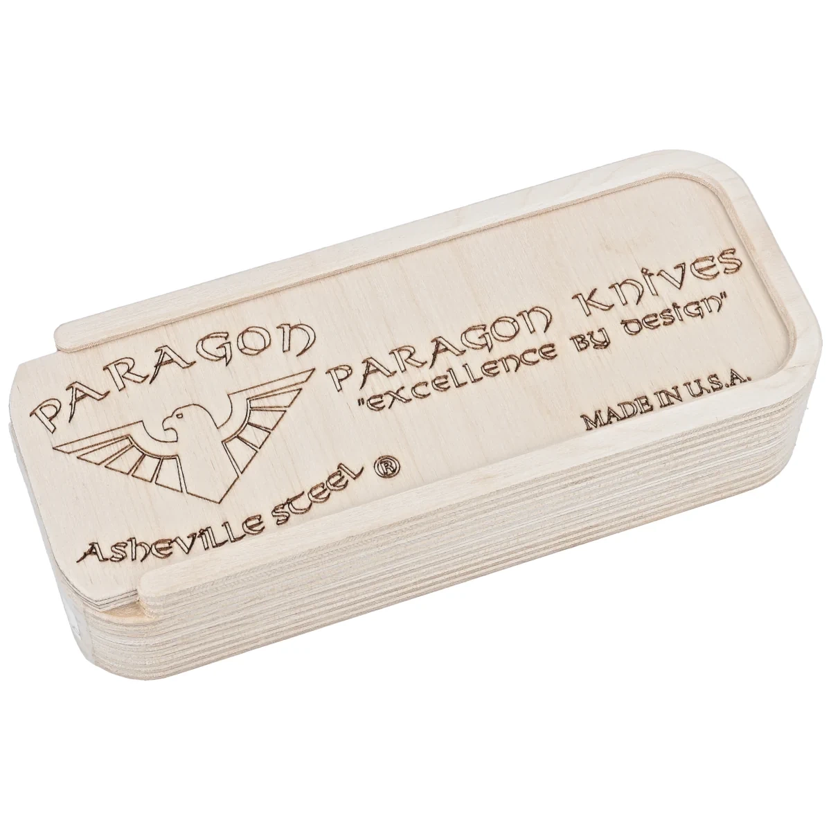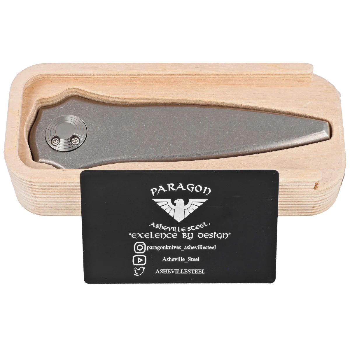 Nóż grawitacyjny Paragon Warlock Smooth Gray Titanium, Damascus Baker Forge Raindrop Gomai Copper Shim 80CRV (TY-WAR-SM-S-BFD)