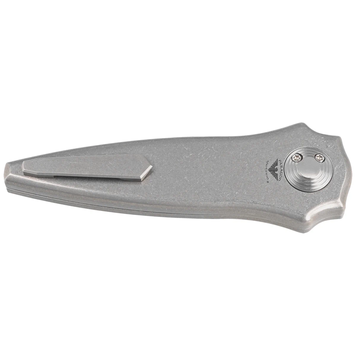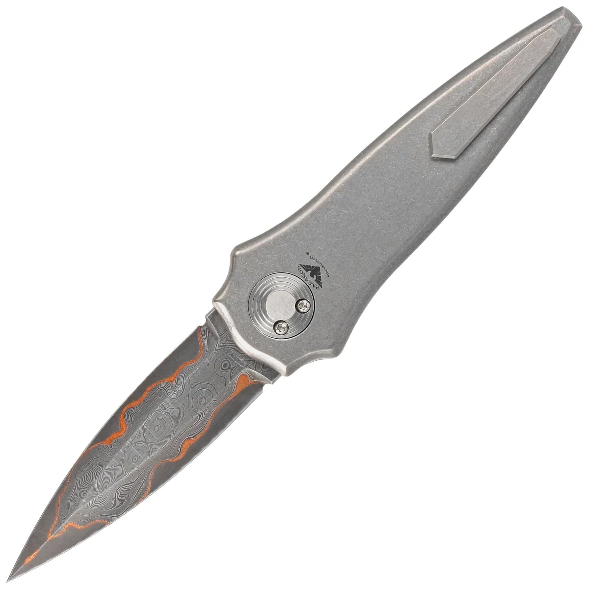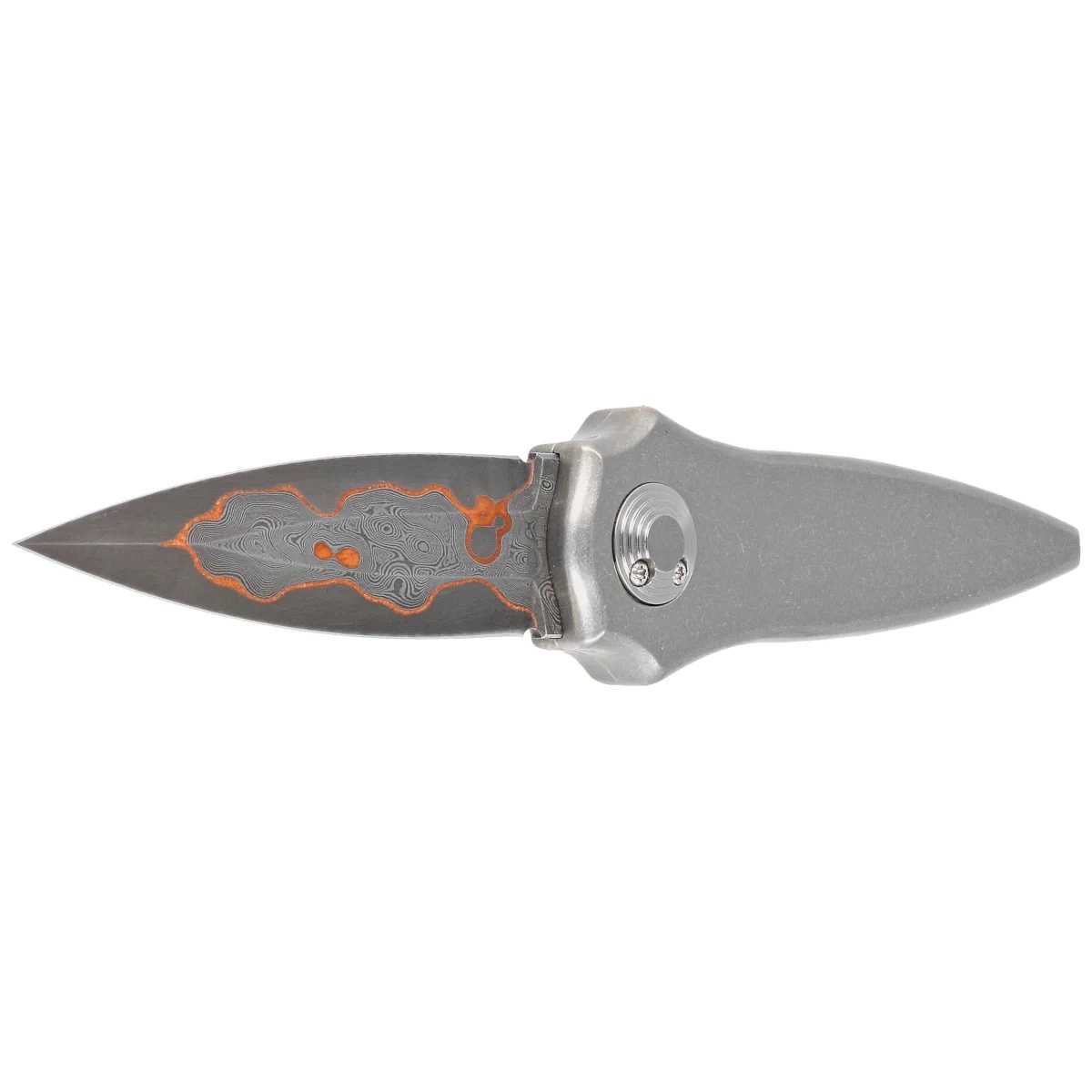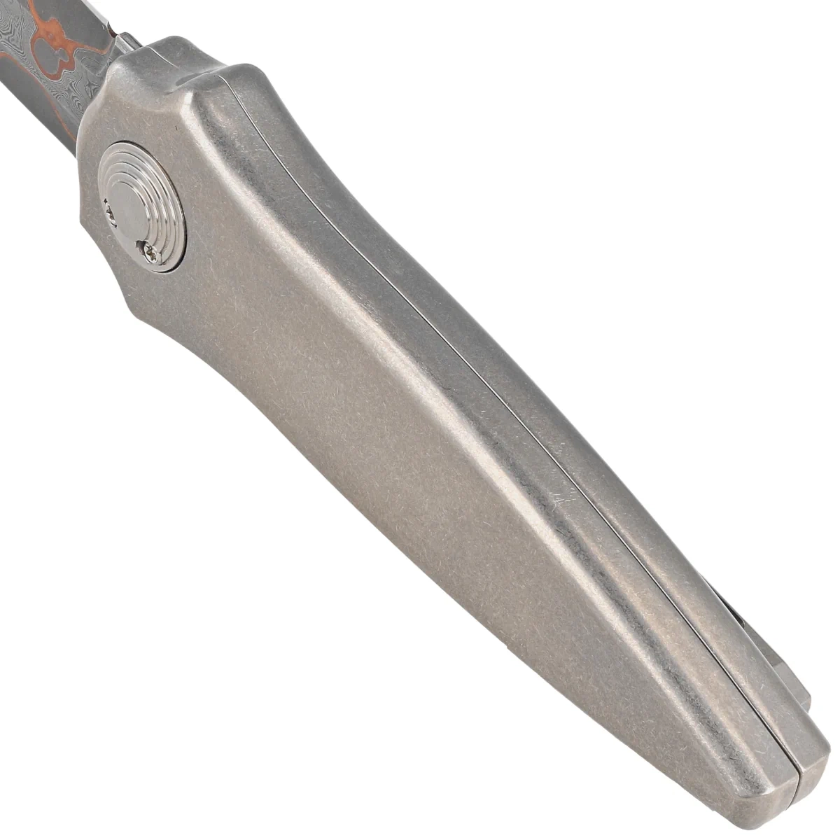 - Warlock Smooth Gray Titanium, Baker Forge Raindrop Gomai Copper Shim 80CRV, duży nóż składany z nietypowym sposobem otwierania grawitacyjnego. Okładziny z tytanu, głownia z pięknego damastu wykutego w kuźni Baker Forge.