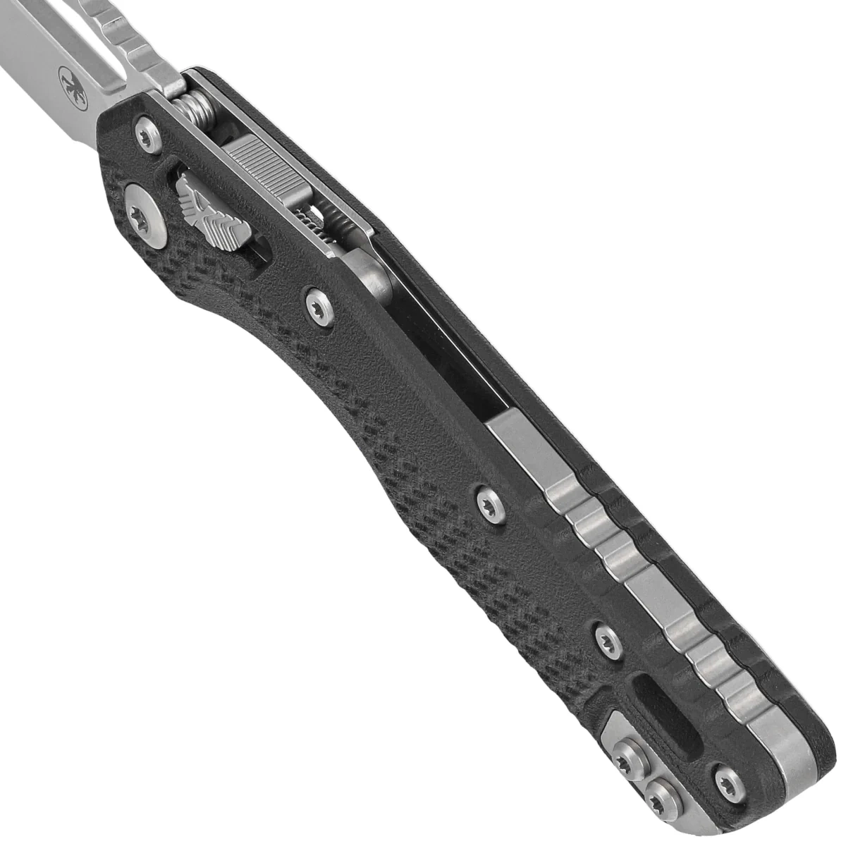 Rękojeść - wykonana z wytrzymałego polimeru, dla lepszego uchwytu pokryta fakturą Tri-Grip. Szeroki suwak blokady z charakterystyczną dla firmy Microtech schodkową strukturą X. Obie okładziny zostały skręcone przy pomocy solidnego, aluminiowego backspacera. Dwustronny (prawa / lewa) klips pozwala dyskretnie nosić nóż w pozycji tip-up. Nad klipsem lanyard hole, miejsce na linkę zabezpieczającą lub ozdobną.