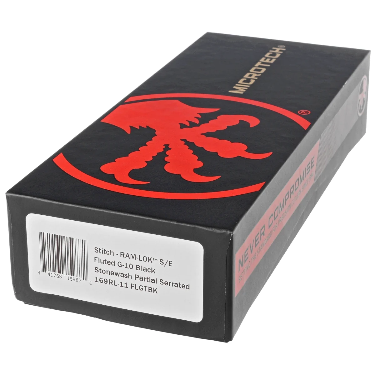 - Stitch Ram-Lok S/E Black Fluted G10, Stonewashed P/S manualna wersja popularnego projektu Sebastijana Berenjiego z Borka Blades i firmy Microtech. Szerokie ostrze w kształcie harpuna, doskonałe materiały i legendarna jakość wykonania od Microtech Knives.