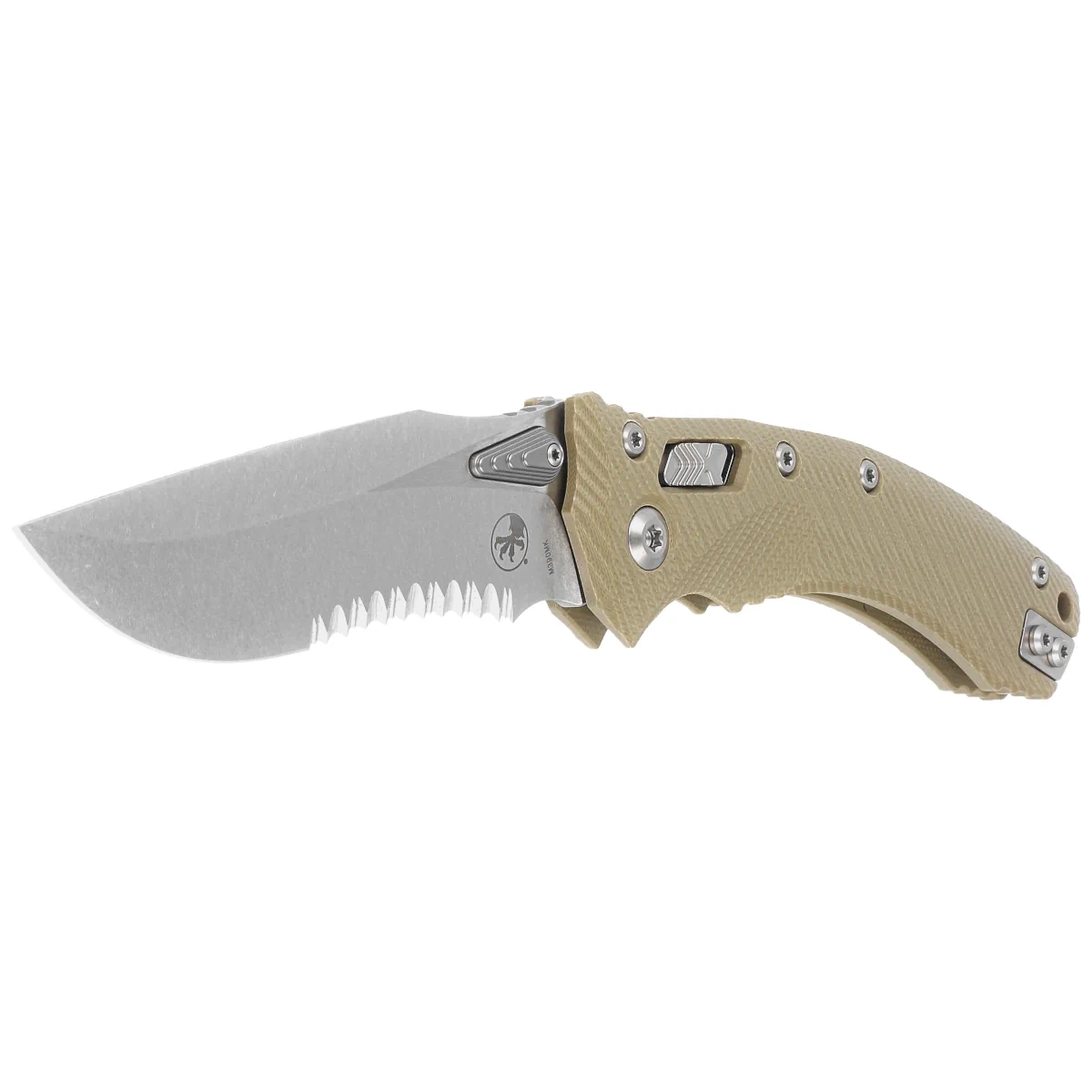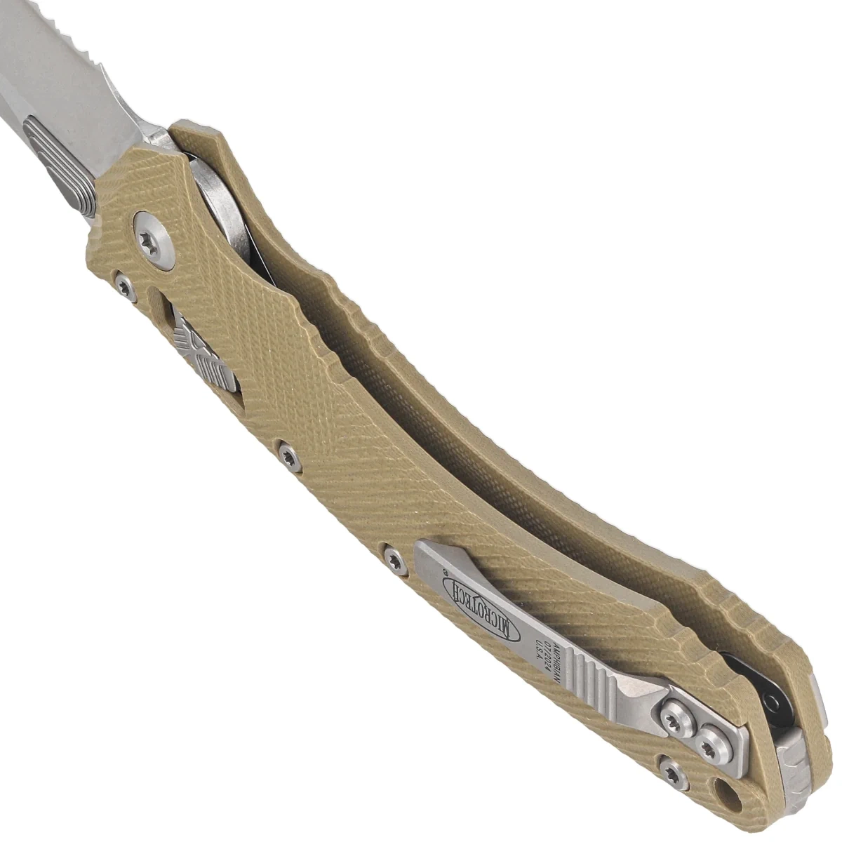 Rękojeść - wykonana z wytrzymałego kompozytu G10, dla lepszego uchwytu pokryta wyfrezowanymi liniami (Fluted). Szeroki suwak blokady z charakterystyczną dla firmy Microtech schodkową strukturą X. Obie okładziny zostały skręcone przy pomocy solidnego, backspacera. Dwustronny (prawa / lewa) tytanowy klips pozwala dyskretnie nosić nóż w pozycji tip-up. Nad klipsem lanyard hole, miejsce na linkę zabezpieczającą lub ozdobną.