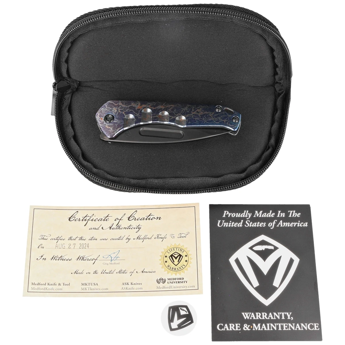 Nóż składany Medford Praetorian Slim D/P Flamed Titanium, DLC HW, Blue Clip, Black DLC S45VN by Greg Medford (MK2084TD-03TM-TPCP-Q4)