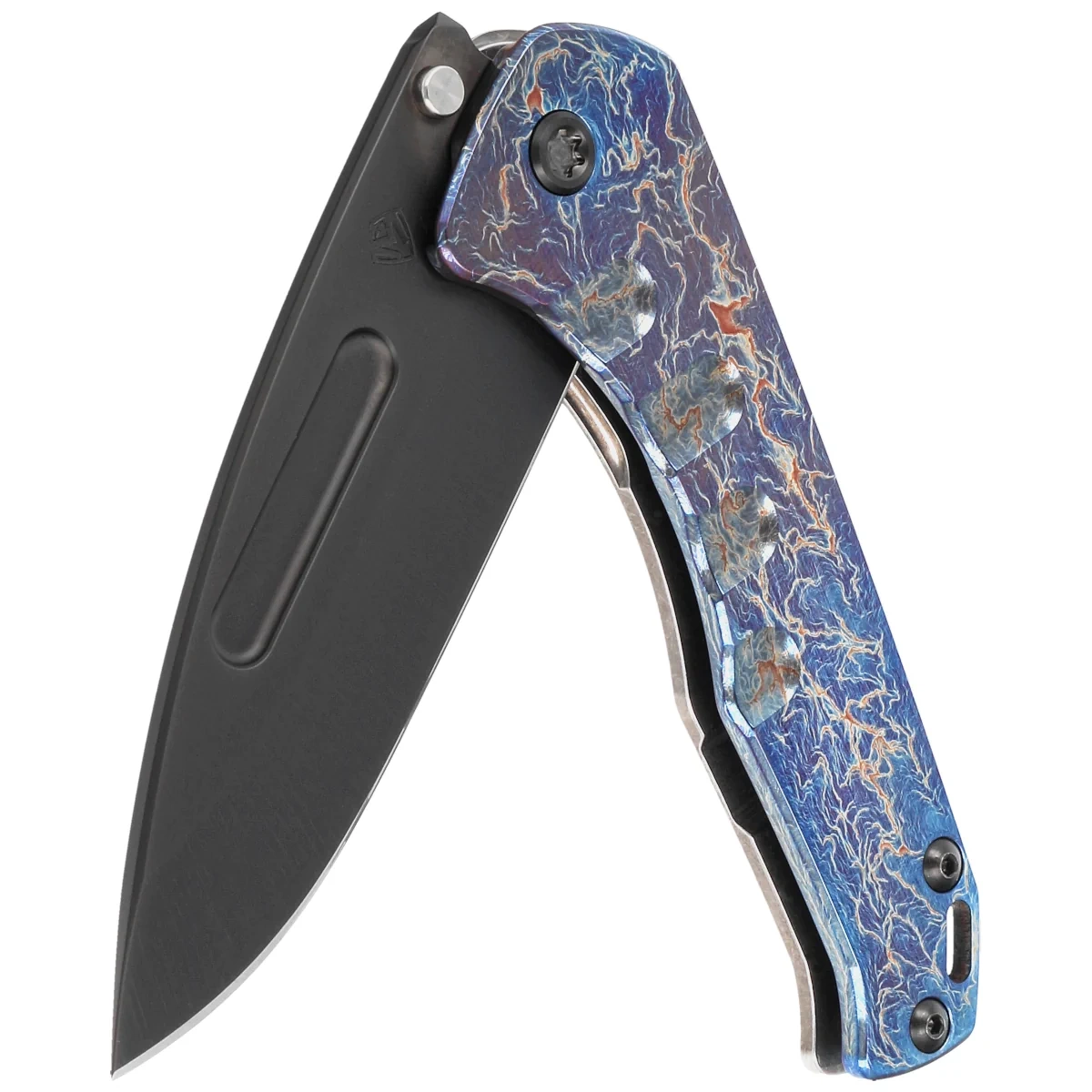 Rękojeść z tytanu, barwiona płomieniowo. Całości dopełnia masywny klips, oczywiście również z tytanu, anodysowany na niebiesko. Śruby pokryte czarną powłoką DLC.