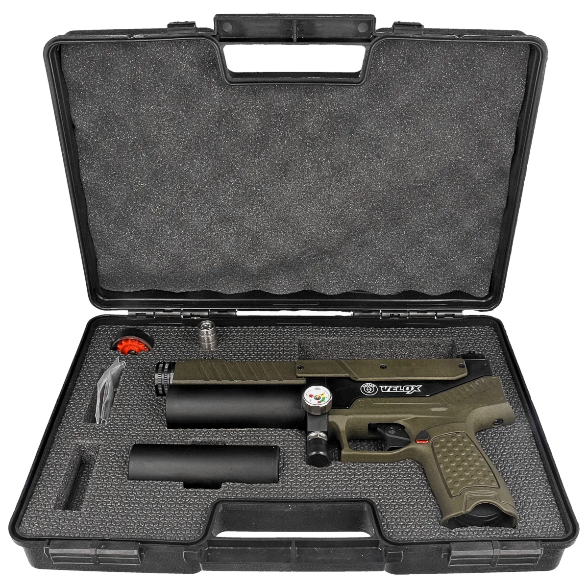 - Velox Olive Drab .177 półautomatyczny pistolet PCP Hatsan z systemem przeładowania semi-auto. Idealny do dynamicznego strzelania. Dwa kartusze 50 cc, napełniane do 250 barów zapewniają długotrwałe strzelanie. Dostępny w kalibrach 4.5 mm, 5.5 mm, 6.35 mm.