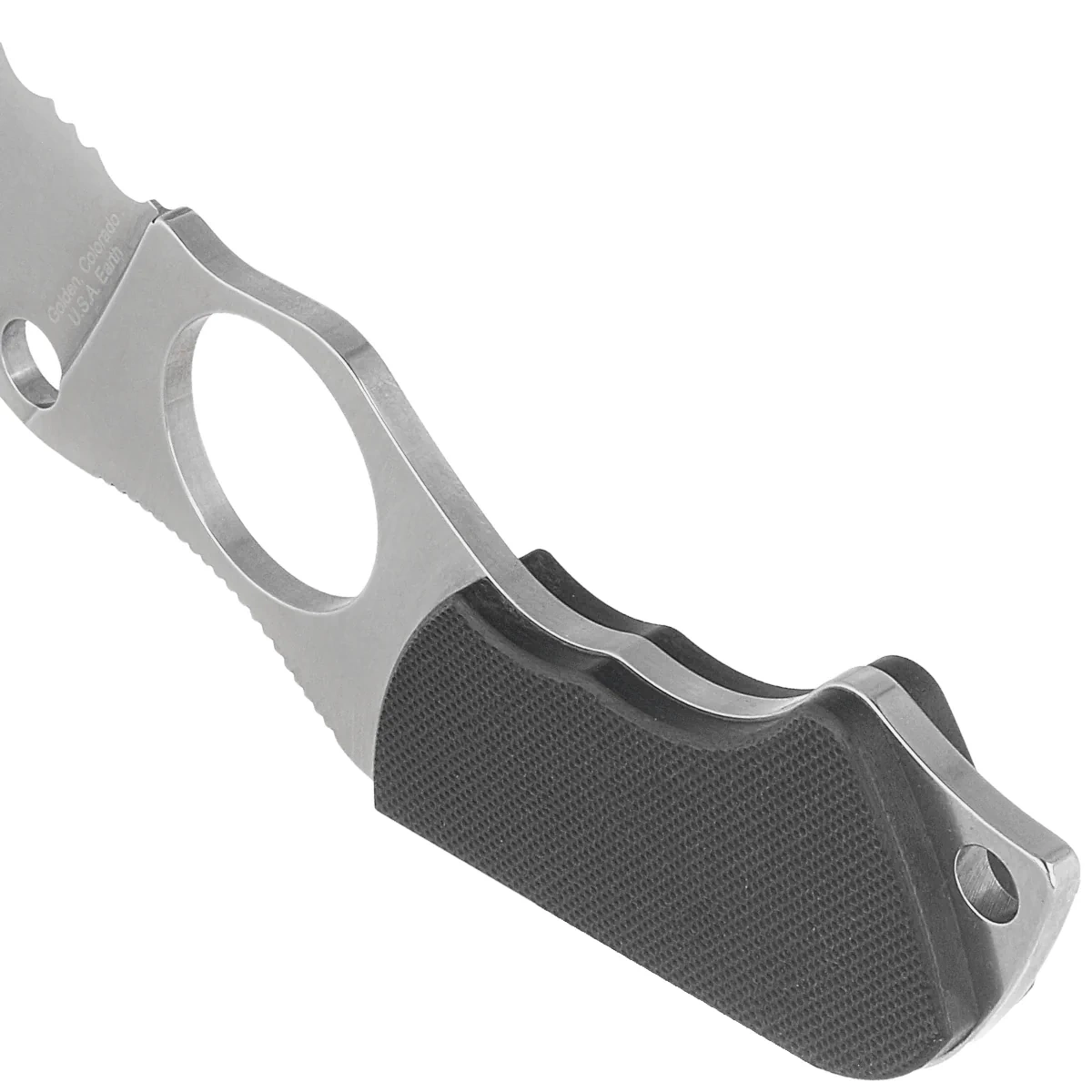 Rękojeść - tang noża z okładzinami, z kompozytu G10, praktycznie niezniszczalnego tworzywa, niewrażliwego na warunki atmosferyczne, odpornego na chemikalia i uszkodzenia mechaniczne. W przedniej części znajdziemy otwór na palec wskazujący, ten rodzaj chwytu uniemożliwia zsunięcie się dłoni na ostrze. Prosta, solidna konstrukcja daje gwarancję wieloletniego użytkowania. W tylnej części rękojeści wystający fragment tanga tworzy zbijak do szyb, zawiera również lanyard hole, otwór na linkę zabezpieczającą lub ozdobną.