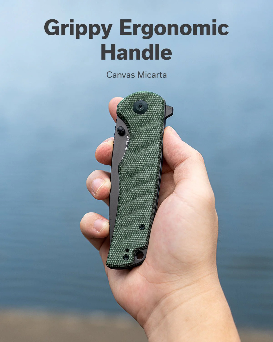Praktisk Green Canvas Micarta, Black duży nóż składany dla każdego entuzjasty EDC. Głownia Drop Point ze stali nierdzewnej 9Cr18MoV, okładziny rękojeści z kompozytu Canvas Micarta. Obustronny kołek Thumb Stud, szybka płetwa Flippera (index-finger flipper) umożliwiają otwarcie ostrza na dwa sposoby. Solidna budowa, która nie zawiedzie. Idealny towarzysz podczas codziennych wędrówek! Bestseller!